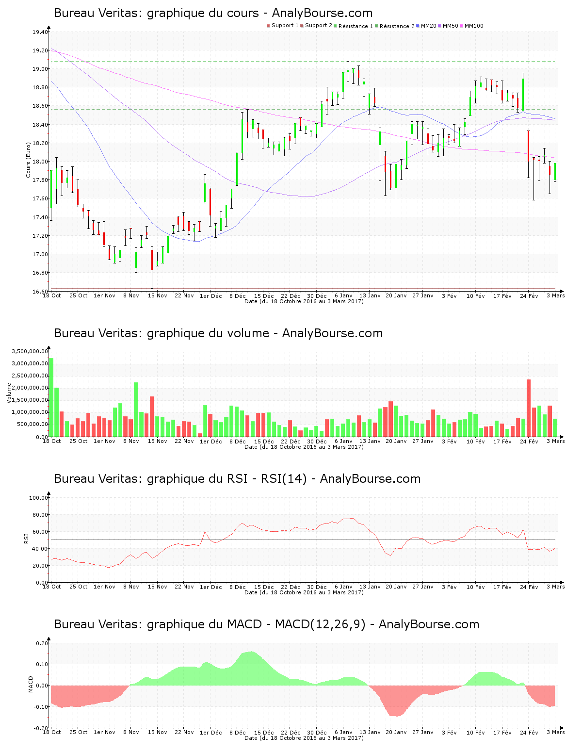 Du côté des indicateurs, on relève que ces cinq dernières séances le RSI est stable. Ce dernier se situe par conséquent toujours au niveau de vente. La moyenne mobile sur vingt jours de l’action Bureau Veritas se localise au-delà de la moyenne mobile sur cinquante jours, qui se situe pour sa part au-delà de la moyenne mobile sur cent jours. L’action traduit par conséquent un comportement haussier sur une longue période. Pour finir, le MACD est ces dernières séances en vigoureuse diminution. Ce dernier signale désormais une trajectoire du cours en substantielle baisse sur le court-moyen terme.