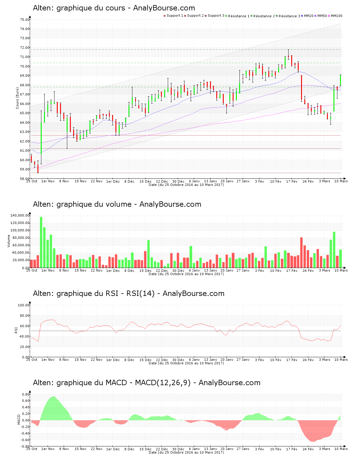|Avec un mouvement haussier de 6.01%, la valeur Alten est en vigoureuse augmentation ces cinq derniers jours. Cette dernière atteint désormais un montant de 69.000 €. Le parcours était à l’équilibre la semaine dernière pour Alten, avec un cours décroissant de 0.64%. L’action reprend ainsi son développement en progression. On relève une relative nervosité ces dernières séances sur le titre, avec un pourcentage de 8.31% qui distance les extrêmes de Alten. Le cours a franchi la résistance des 67.770 € cette semaine. La résistance suivante se place à 70.350 €. C’est au niveau inférieur de son canal que l’action évolue.
