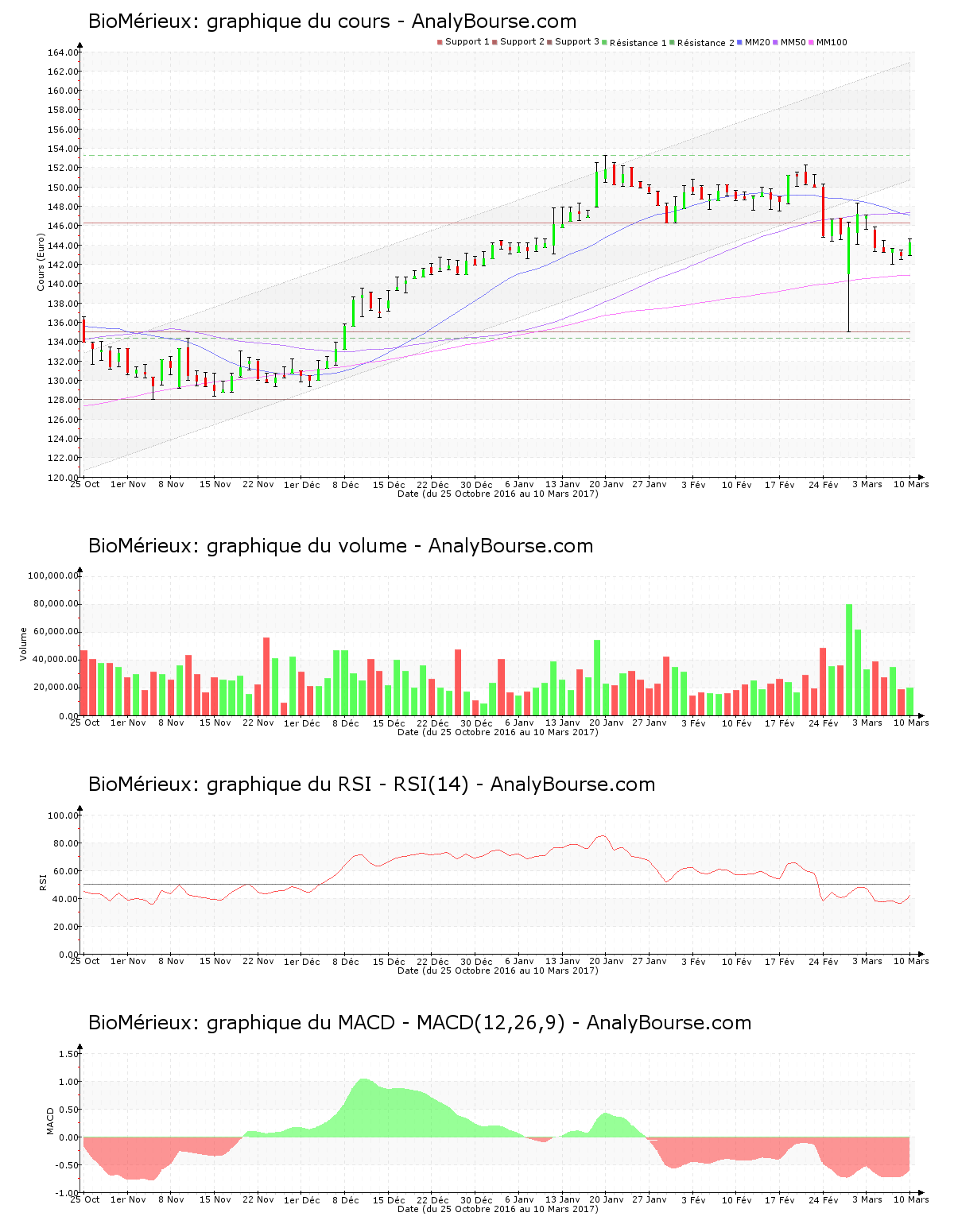 Pour les indicateurs, on observe que cette semaine le MACD est en ferme régression. C’est maintenant une tendance du cours en substantielle baisse qu’il dévoile sur le court-moyen terme. Pour sa part, le RSI est relativement stable ces dernières séances. Il se positionne ainsi encore dans le niveau de vente. Enfin, la moyenne mobile sur vingt jours de la valeur BioMérieux se situe en-dessous de sa moyenne mobile sur cinquante jours depuis jeudi dernier.