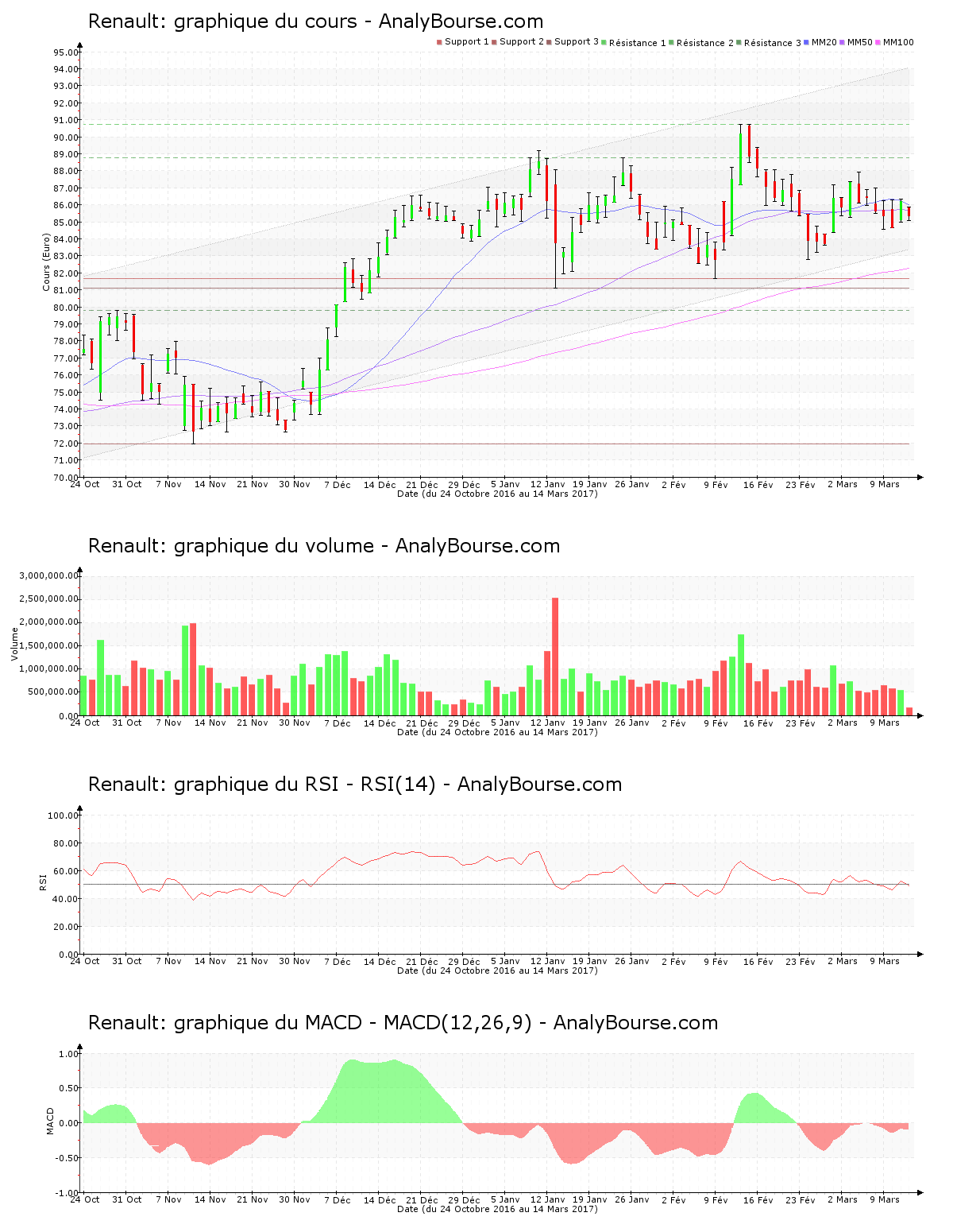 Avec un cours décroissant de 1.01%, Renault décroît ce mardi 14 mars, dans un volume d’environ 163000 actions échangées à 11:45. La valeur se négocie finalement à 85.330 €. Renault se revalorisait à l’inverse hier, avec un parcours haussier de 1.81%. La répartition acheteurs/vendeurs se retourne donc faiblement ce mardi 14 mars. Le cours fluctue maintenant près du support des 81.650 €.