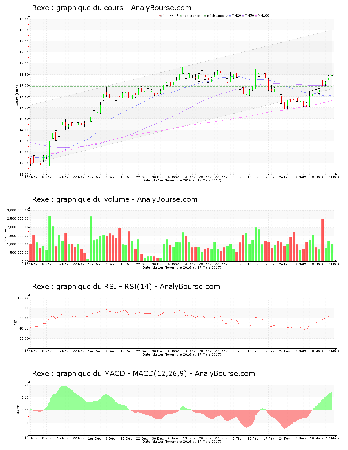 En ce qui concerne les indicateurs, concernant le RSI, on note qu’il est en croissance ces dernières séances. Il se localise maintenant au niveau d’achat. Pour le MACD, on constate que ce dernier est en ferme progression ces cinq derniers jours. Il dévoile à présent une tendance du titre en importante croissance sur le court-moyen terme. Enfin, depuis désormais 70 séances, la moyenne mobile sur 50 jours de la valeur Rexel se localise au-delà de sa moyenne mobile sur 100 jours.