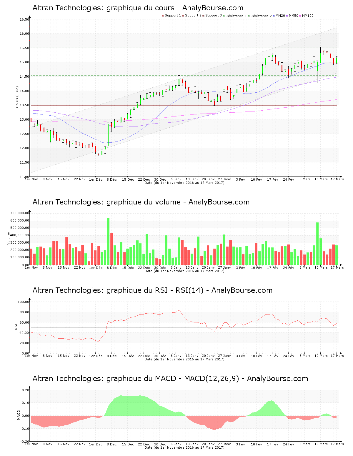 Avec un cours décroissant de 1.05%, Altran Technologies est en décroissance ces dernières séances. L’action se revend désormais à 15.150 €. Caractérisée par un cours croissant de 3.73%, la demande sur Altran Technologies la semaine dernière était à l’inverse bien présente. La pondération acheteurs/vendeurs se retourne par conséquent faiblement ces derniers jours. La valeur se positionne au milieu du canal dans lequel cette dernière se développe ces dernières semaines.