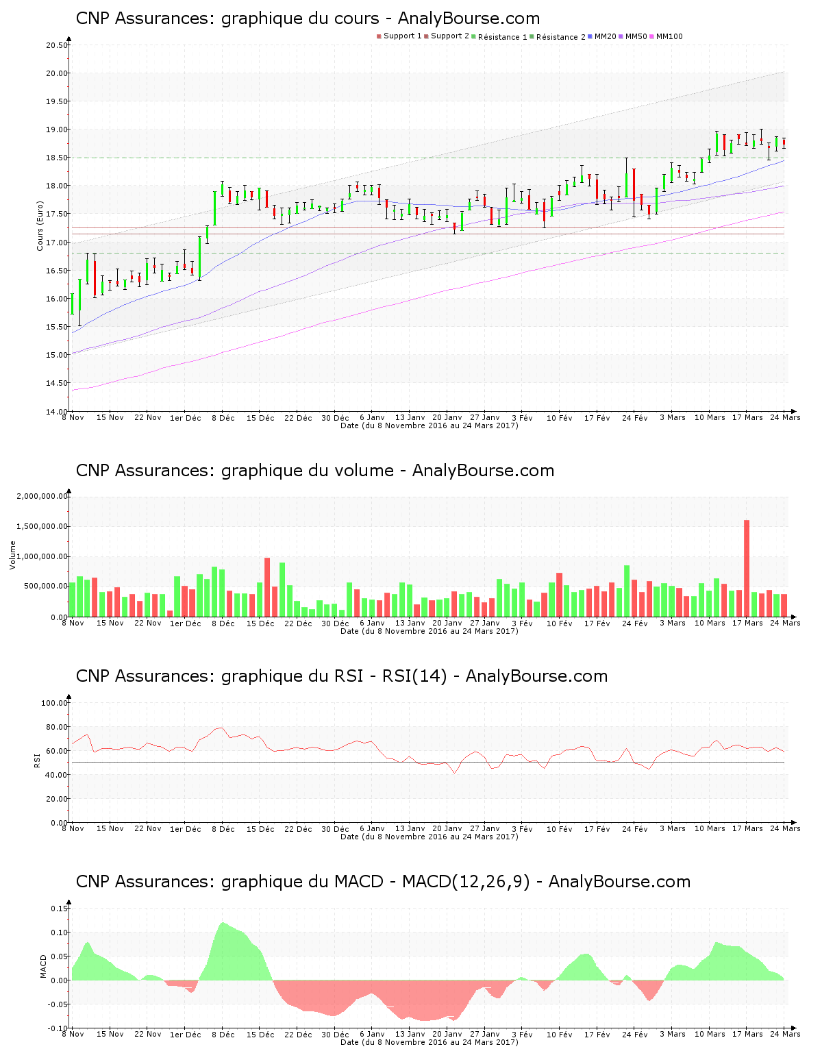 La valeur CNP Assurances connaît ces dernières séances une certaine stabilité, représentée par un mouvement baissier de 0.05%. Elle s’apprécie en effet juste à 18.730 €. Avec un cours croissant de 1.19%, CNP Assurances s’appréciait au contraire la semaine dernière. C’est au milieu de son canal que l’action se développe.