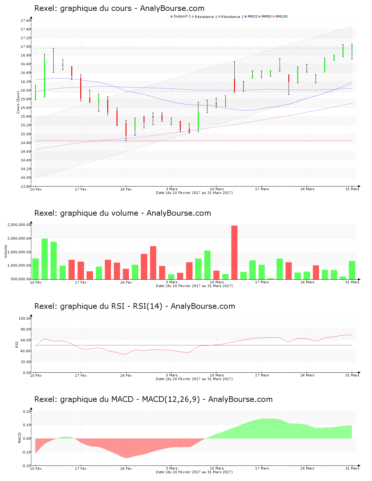 Avec un cours haussier de 3.21%, le constat est positif ces cinq derniers jours de cotations pour la valeur Rexel. Elle cote à présent à 17.020 €. Avec un cours croissant de 0.30%, le parcours était à l’équilibre la semaine dernière pour Rexel. Le mouvement en hausse reprend ainsi ces cinq dernières séances. Remarquons, avec un taux de 5.51% qui distance cette semaine le maximum du minimum, une certaine volatilité sur Rexel. Le cours a passé la résistance des 16.960 € cette semaine. L’action se positionne dans la zone supérieure du canal à l’intérieur duquel elle se borne depuis plusieurs semaines.