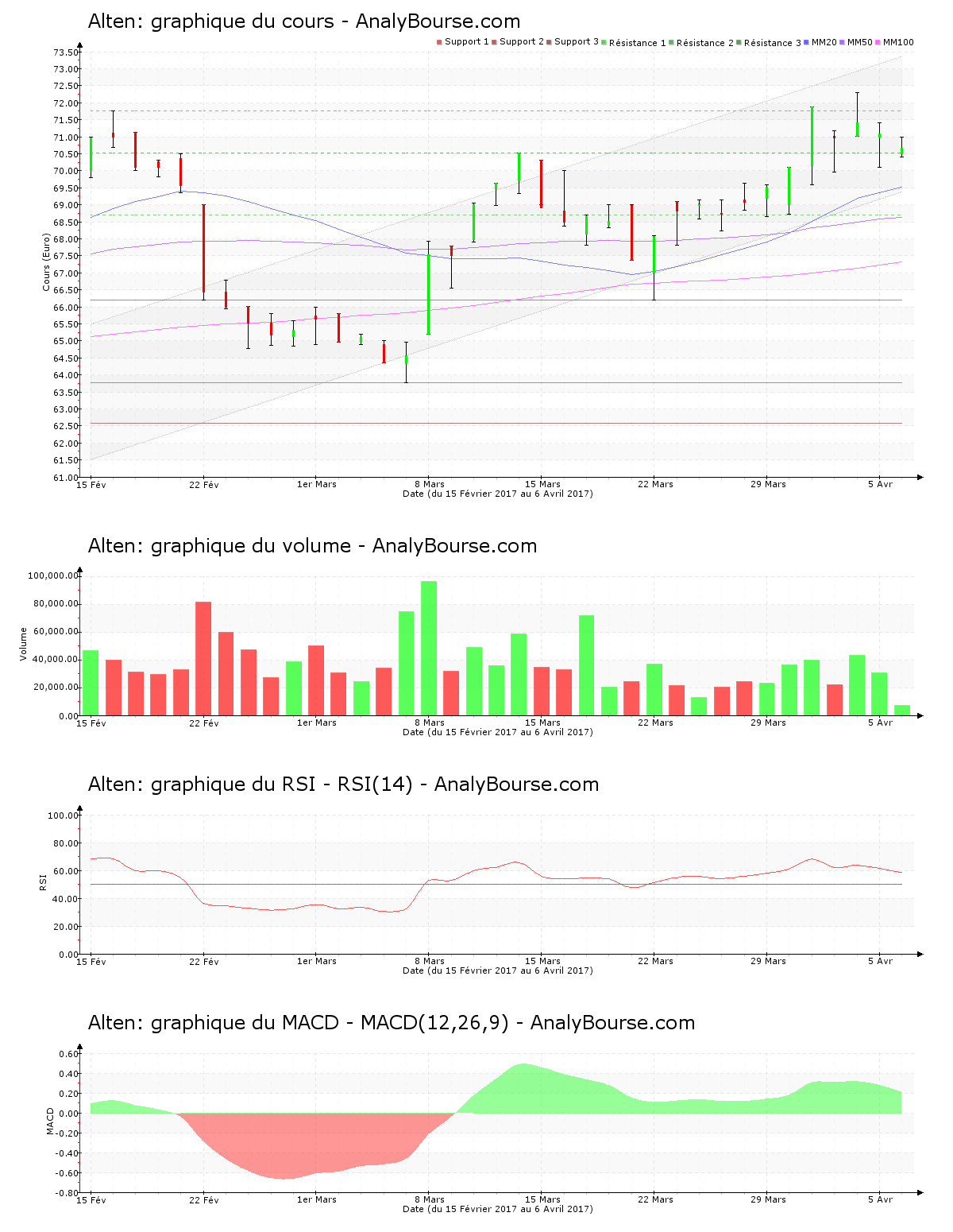 |C’est la première fois que l’action Alten dépasse ce niveau depuis le vendredi 17 février 2017. La valeur Alten est relativement stable ces derniers jours, avec un parcours haussier de 0.80%. Elle atteint en effet juste 70.650 €. Avec un mouvement haussier de 1.86%, Alten était au contraire en progression la semaine dernière. Le titre a passé la résistance des 70.520 € cette semaine. La résistance suivante se localise à 71.770 €. L’action se localise dans la zone inférieure du canal à l’intérieur duquel elle évolue depuis quelques semaines.