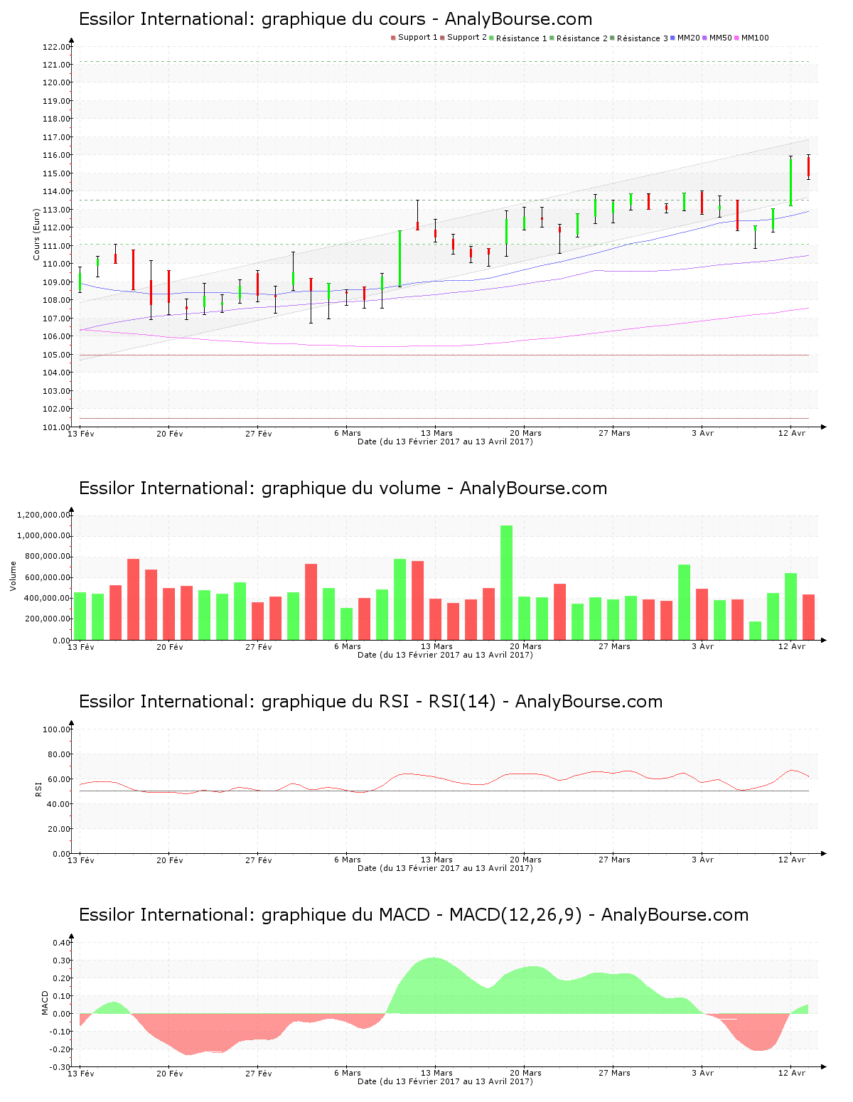 Ces informations constituent une analyse technique de l’action Essilor International au samedi 15 avril 2017. Cette analyse peut être invalidée par des éléments plus récents, et ne constitue en aucune manière une incitation d’achat ou de vente sur les marchés financiers. Le lecteur reste libre et responsable de l’interprétation et de l’usage faits de ces informations.
