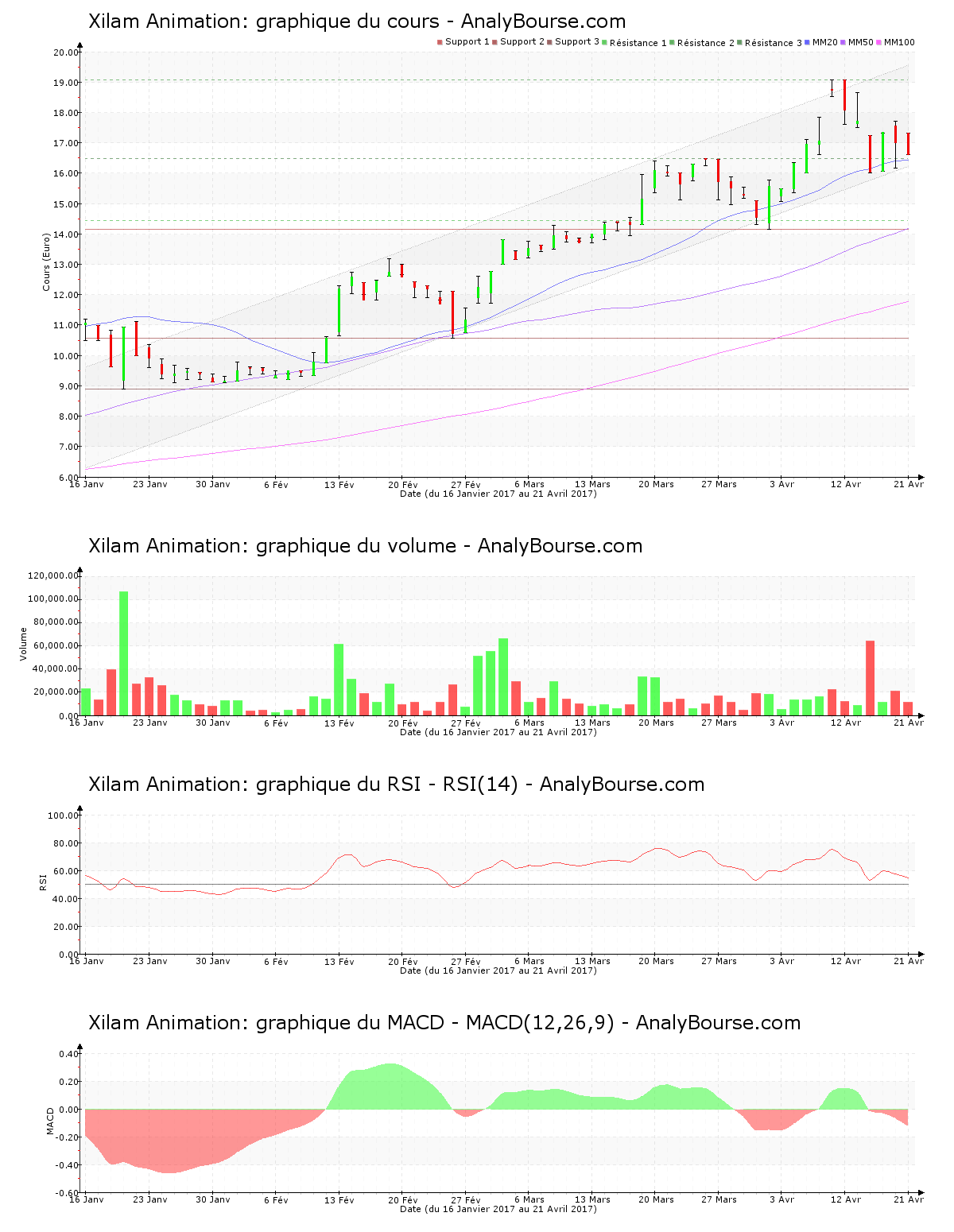 Avec un cours baissier de 8.14%, Xilam Animation décroche ces cinq dernières séances de cotations. L’action atteint à présent la cotation de 16.600 €. Reflétée par un mouvement haussier de 16.73%, Xilam Animation subissait à l’inverse la semaine dernière une grande pression acheteuse. La valeur Xilam Animation se retourne par conséquent avec force ces cinq derniers jours. Le titre fluctuant dans un range de 16.42%, la valeur enregistre une fébrilité sensible ces derniers jours. C’est à proximité de la limite inférieure de son canal que l’action varie.
