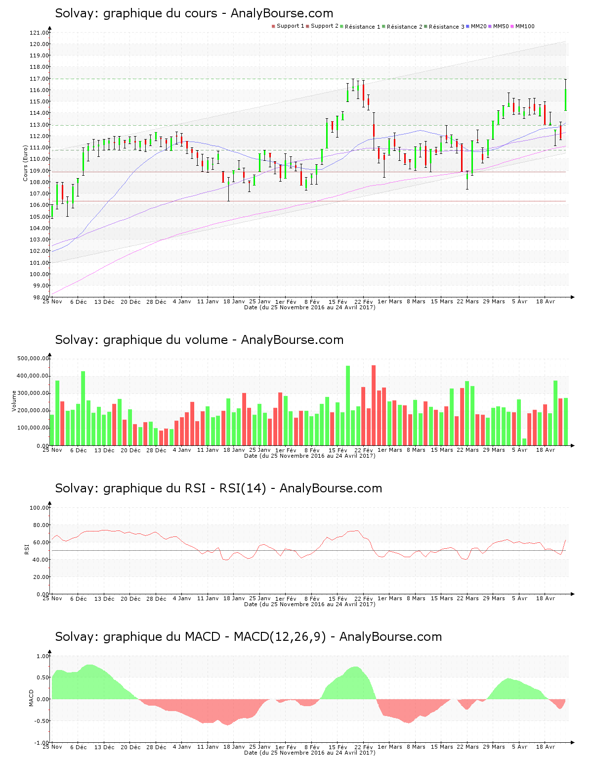 Côté indicateurs, on constate que ce jour l’indicateur RSI est en croissance. Il a basculé dans le niveau d’achat, ceci peut montrer un départ d’une trajectoire croissante à long terme pour l’action Solvay.