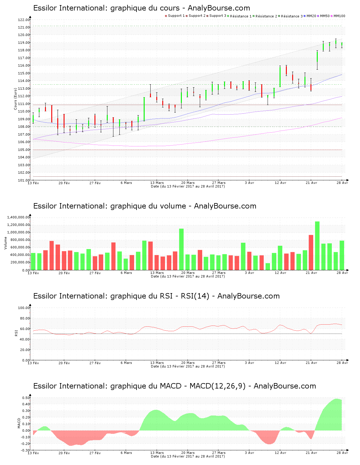 Concernant les indicateurs, on repère que ces cinq derniers jours l’indicateur MACD est en importante croissance. C’est finalement une trajectoire du titre en vigoureuse hausse que ce dernier révèle à moyen-court terme. Lundi dernier, l’indicateur MACD a basculé du côté positif, cela peut montrer une base de tendance en croissance sur une longue période pour Essilor International. On repère que le RSI est en hausse ces cinq derniers jours de cotations. C’est désormais au niveau d’achat qu’il se localise. La moyenne mobile sur vingt jours de la valeur Essilor International se localise au-delà de la moyenne mobile sur cinquante jours, et la moyenne mobile sur cinquante jours se positionne elle-même au-dessus de la moyenne mobile sur cent jours. Le mouvement de la valeur est donc en hausse sur le long terme. Depuis finalement 84 jours, la moyenne mobile sur vingt jours de la valeur Essilor International se localise au-delà de sa moyenne mobile sur cinquante jours.