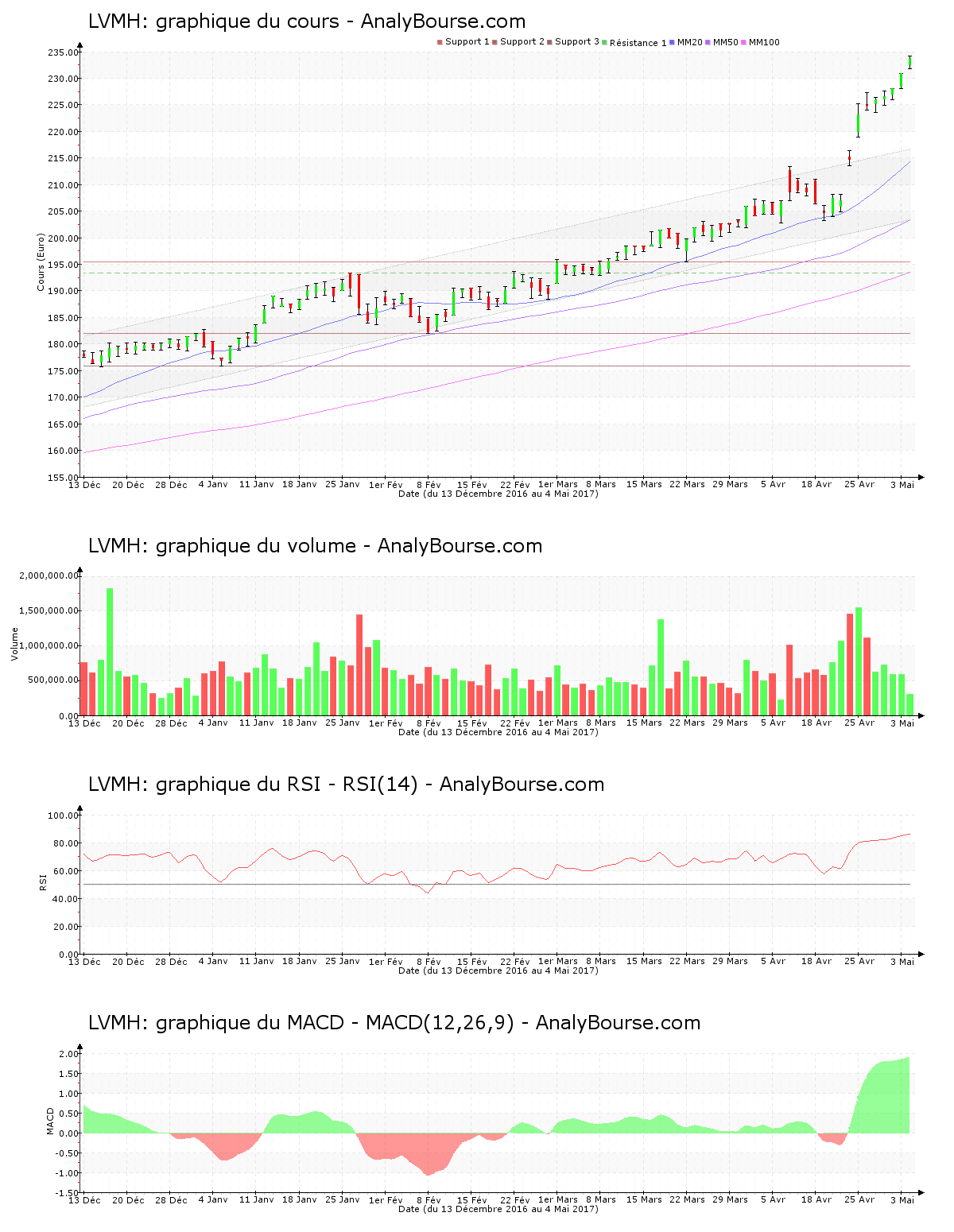 Le mouvement haussier de l’action LVMH perdure maintenant depuis 8 jours. Incarnée par un comportement haussier de 12.95%, le cours de LVMH connaît par conséquent depuis le lundi 24 avril 2017 une ferme pression acheteuse. Avec un cours croissant de 1.23%, l’action LVMH est toujours en croissance aujourd’hui, dans un volume de 299000 titres échangés à 13:46. Elle se revalorisait déjà hier, avec un développement haussier de 1.23%. L’action se valorise finalement à 233.700 €.