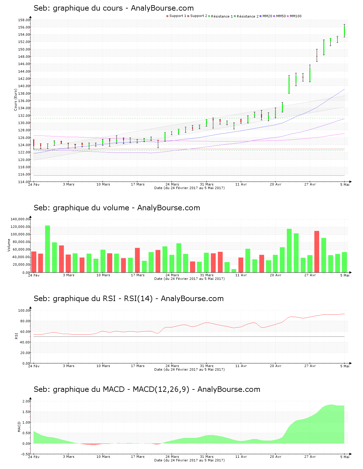 Ces informations constituent une analyse technique de l’action Seb au dimanche 7 mai 2017. Cette analyse peut être invalidée par des éléments plus récents, et ne constitue en aucune manière une incitation d’achat ou de vente sur les marchés financiers. Le lecteur reste libre et responsable de l’interprétation et de l’usage faits de ces informations.