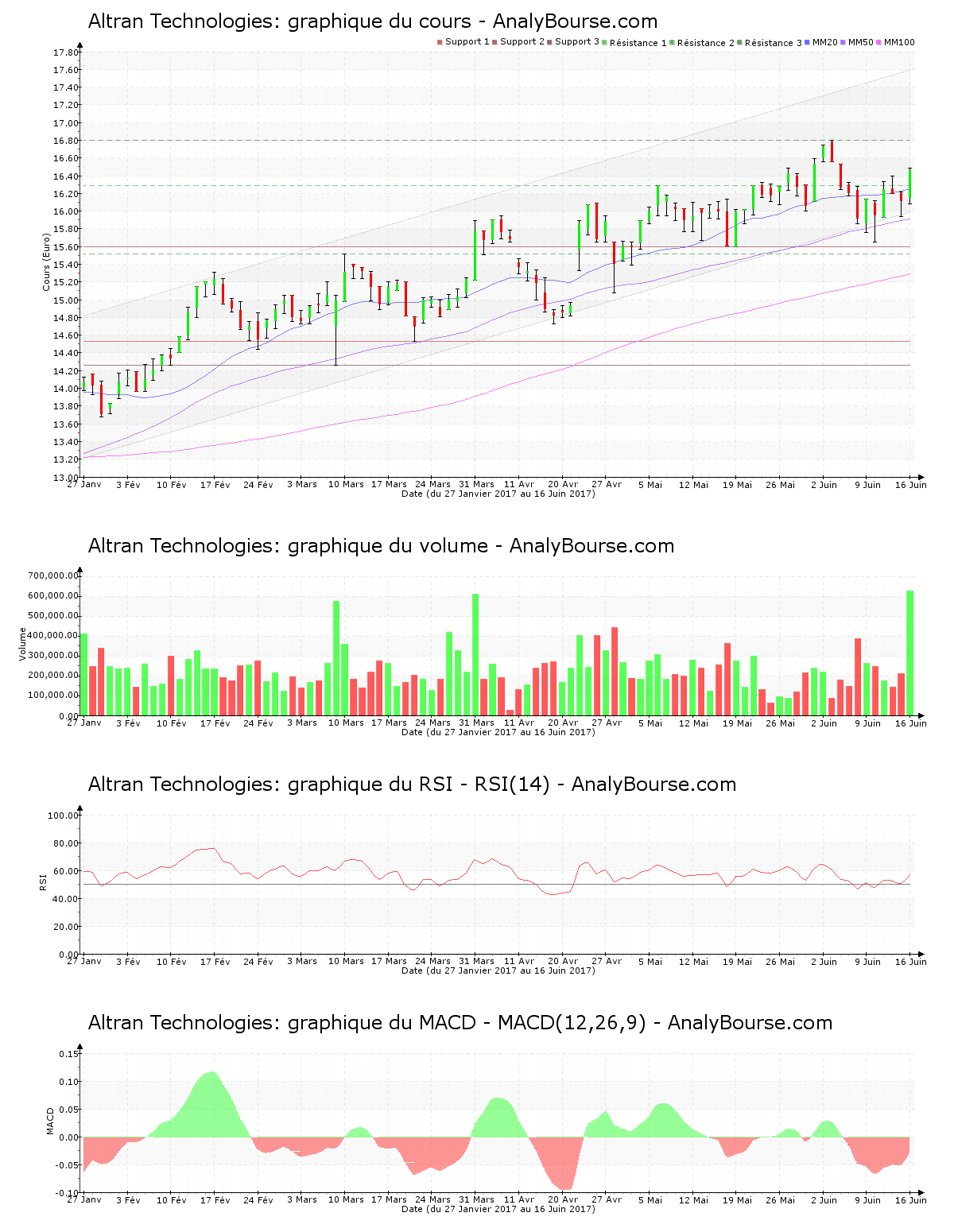 La volonté d’achat sur Altran Technologies ces cinq derniers jours de cotations est bien présente, soulignée par un cours haussier de 1.98%. La valeur se revend dorénavant à 16.460 €. Avec un comportement baissier de 3.53%, Altran Technologies se dépréciait à l’inverse la semaine dernière. La valeur Altran Technologies se reprend par conséquent faiblement cette semaine. Altran Technologies navigue ces cinq dernières séances de cotations dans des limites de 5.37%, ce qui suggère des échanges assez fébriles sur le cours. Le titre a franchi la résistance des 16.290 € cette semaine. La résistance suivante se situe à 16.800 €. C’est dans la zone inférieure de son canal que l’action varie.