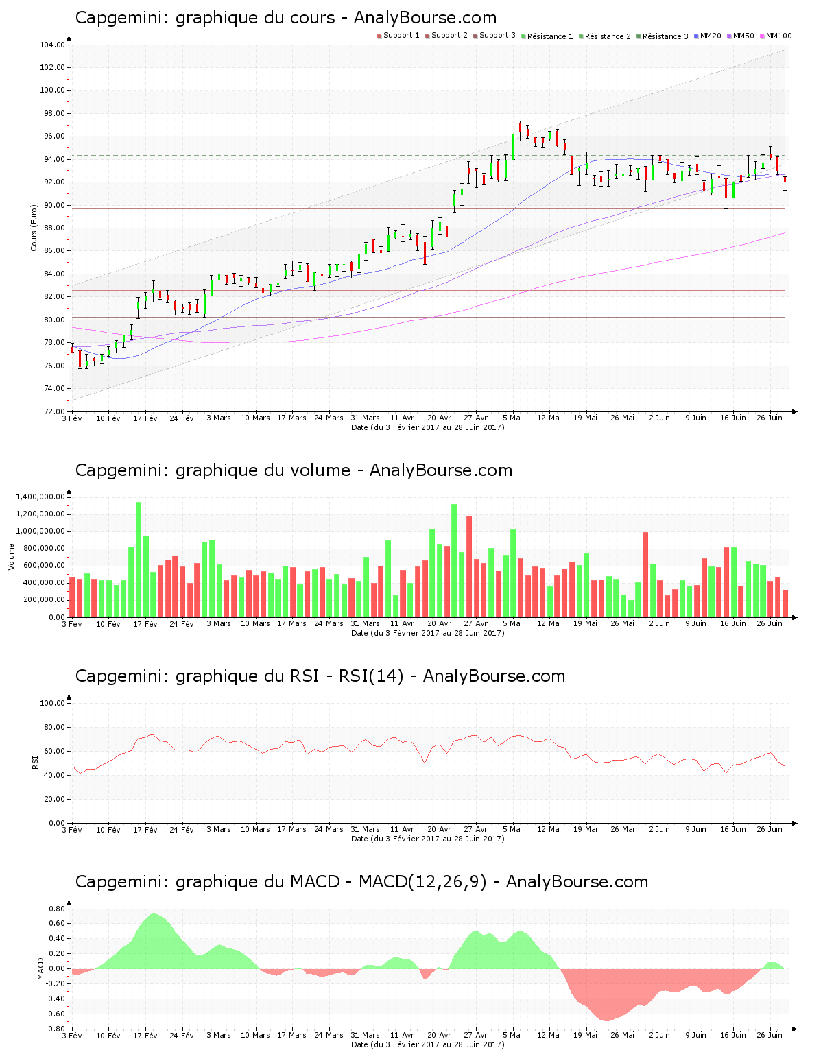 Concernant les indicateurs, concernant l’indicateur RSI, on constate qu’il est en diminution ce mercredi 28 juin. Il est passé au niveau de vente, ce qui pourrait indiquer une base de tendance en régression sur la durée pour la valeur Capgemini. On relève que l’indicateur MACD est en grande baisse ce mercredi 28 juin. Ce mercredi 28 juin, l’indicateur MACD a basculé en terrain négatif, ce qui peut révèler un début d’une évolution en baisse pour la valeur Capgemini sur le long terme.