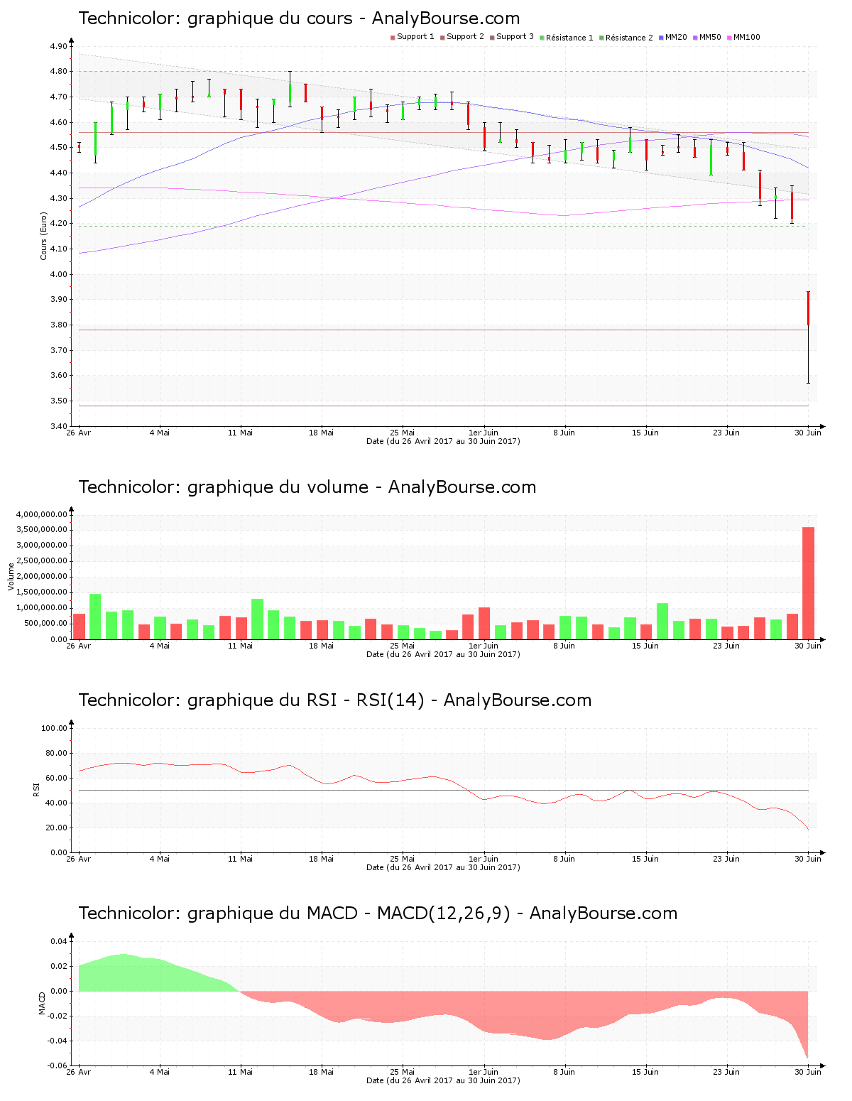 Avec environ quatre millions de titres échangés à 14:05, quantifiée par un comportement baissier de 9.95%, l’action Technicolor supporte toujours ce vendredi 30 juin une conséquente pression vendeuse. Avec un comportement baissier de 2.09%, la valeur se dévalorisait déjà hier. Technicolor s’écroule désormais de 0.420 €, allant de 4.220 € à 3.800 €. Le mouvement baissier prend en vitesse ainsi ce vendredi 30 juin pour l’action. L’action Technicolor n’a pas passé ce seuil depuis le lundi 27 février 2017. Attaquant la séance à 3.930 €, on repère également sur le titre un gap baissier de -6.87% à l’ouverture de la cotation. On repère une agitation sensible aujourd’hui sur le cours, avec un pourcentage de 10.08% qui espace les extremums de la valeur. Le mouvement du cours l’amène maintenant près du support des 3.780 €.