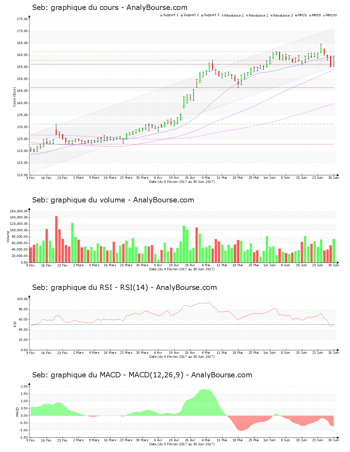 Ces informations constituent une analyse technique de la valeur Seb au dimanche 2 juillet 2017. Cette analyse peut être invalidée par des éléments plus récents, et ne constitue en aucune manière une incitation d’achat ou de vente sur les marchés financiers. Le lecteur reste libre et responsable de l’interprétation et de l’usage faits de ces informations.