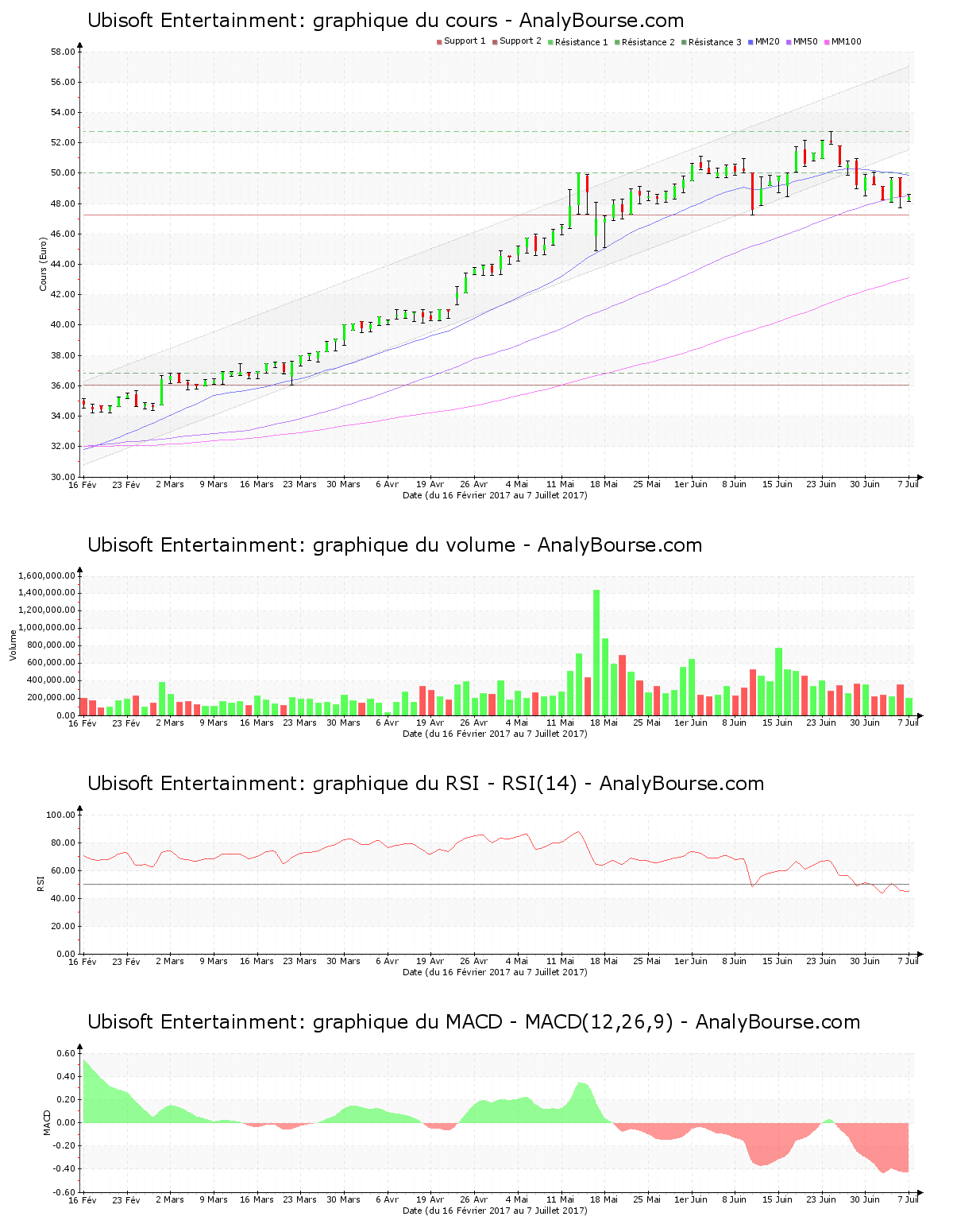 Du côté des indicateurs, pour l’indicateur RSI, on relève qu’il est en diminution ces cinq derniers jours. C’est désormais au niveau neutre qu’il se situe. De son côté, la moyenne mobile sur 20 jours de la valeur Ubisoft Entertainment est située au-delà de sa moyenne mobile sur 50 jours, qui est elle-même positionnée au-dessus de sa moyenne mobile sur 100 jours. Sur la durée, la valeur présente ainsi un développement haussier. Voici désormais 94 jours que la moyenne mobile sur 20 jours de la valeur Ubisoft Entertainment se situe au-delà de sa moyenne mobile sur 50 jours. On observe que le MACD est en ferme diminution cette semaine. Ce dernier suggère dorénavant une évolution du titre en solide baisse sur le moyen-court terme.