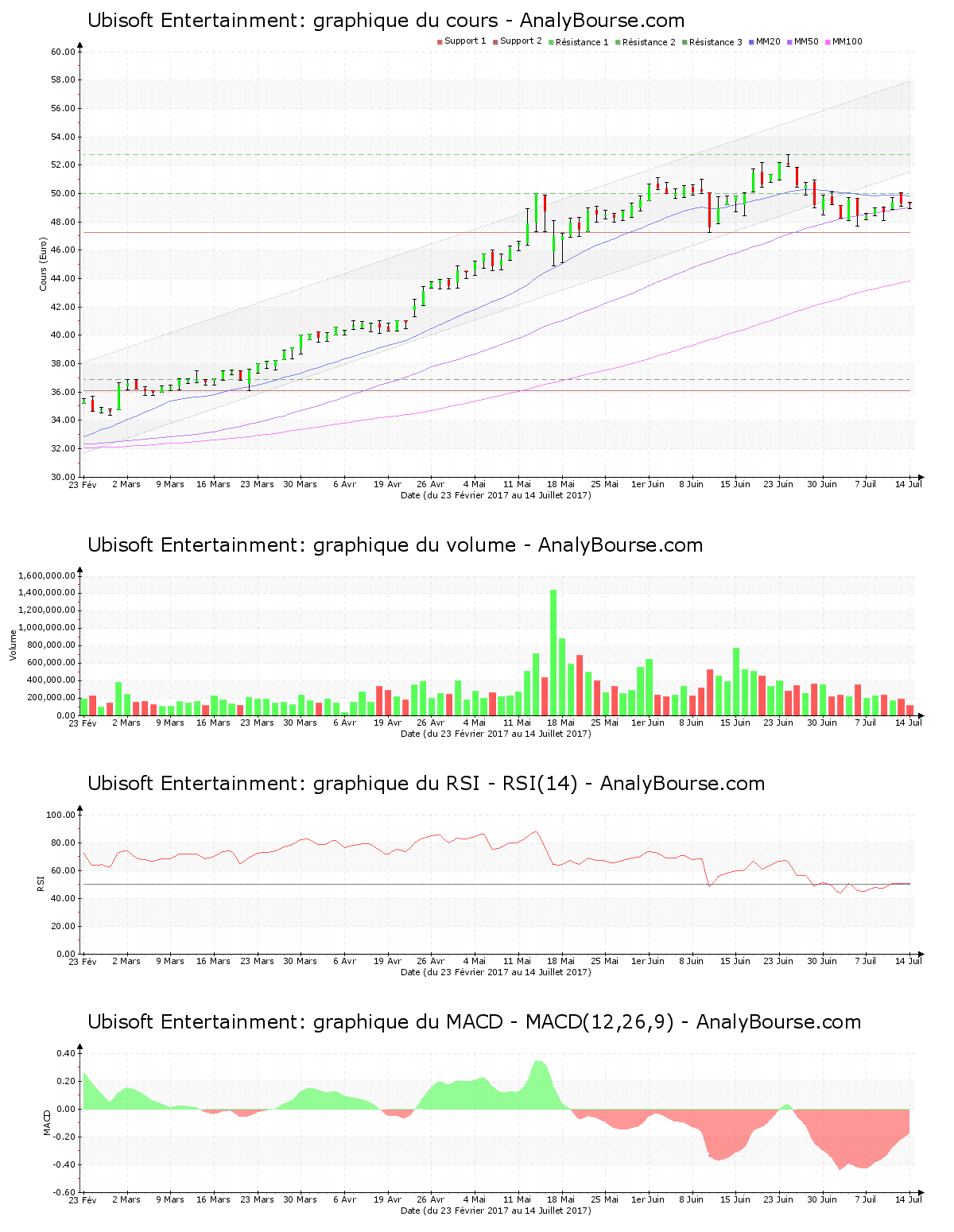 Ces informations constituent une analyse technique de l’action Ubisoft Entertainment au dimanche 16 juillet 2017. Cette analyse peut être invalidée par des éléments plus récents, et ne constitue en aucune manière une incitation d’achat ou de vente sur les marchés financiers. Le lecteur reste libre et responsable de l’interprétation et de l’usage faits de ces informations.