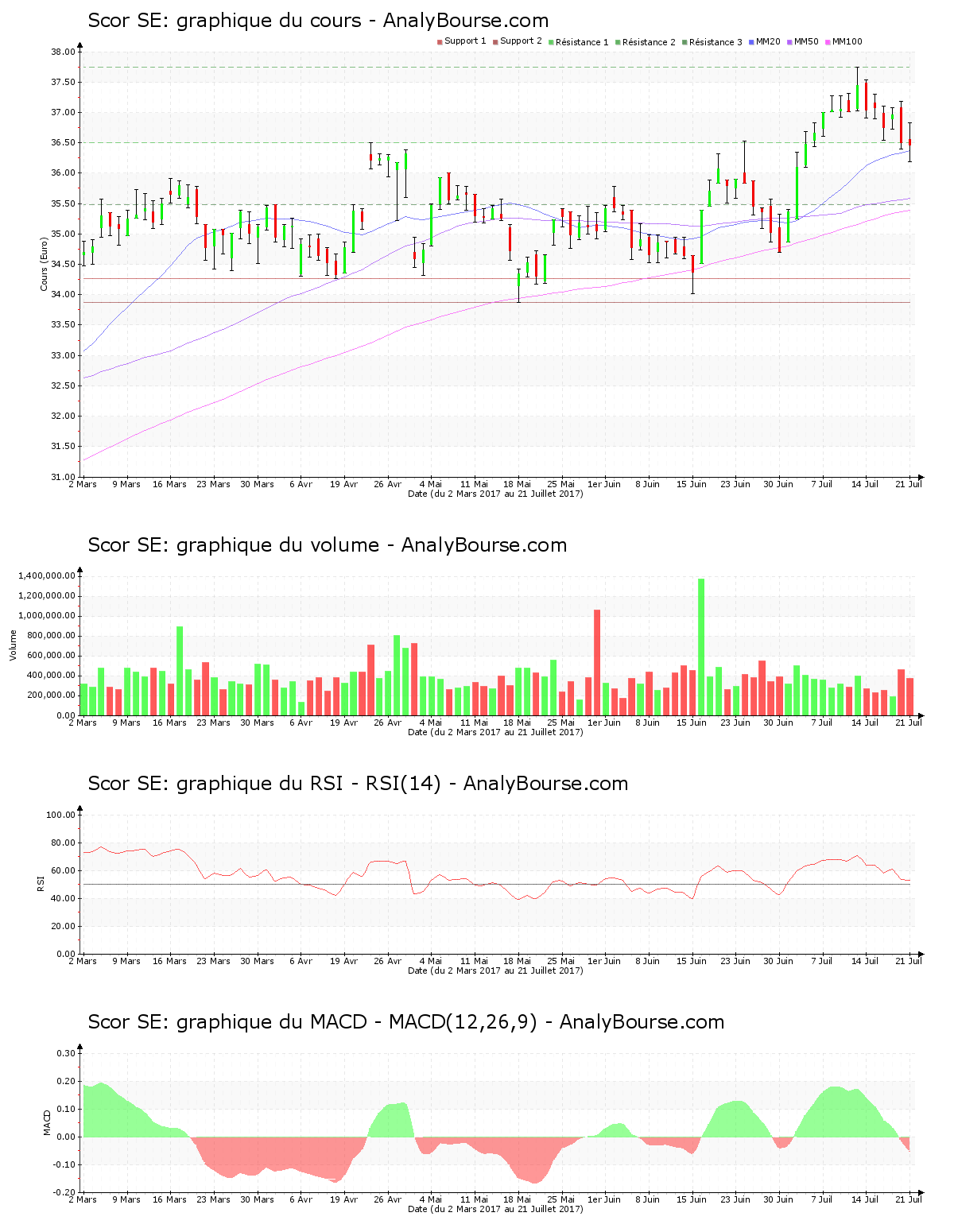Le MACD est cette semaine en conséquente régression. C’est maintenant une tendance du cours en décroissance qu’il dévoile à court-moyen terme. Jeudi dernier, le MACD est passé en secteur négatif, ce qui peut esquisser un prémice d’une trajectoire décroissante à longue échéance pour Scor SE. On note que l’indicateur RSI est en décroissance ces dernières séances. C’est désormais dans le niveau neutre qu’il se trouve. Pour terminer, la moyenne mobile sur 20 jours de la valeur Scor SE se localise au-delà de la moyenne mobile sur 50 jours, qui se situe pour sa part au-delà de la moyenne mobile sur 100 jours. Le mouvement de l’action est donc en progression à long terme.