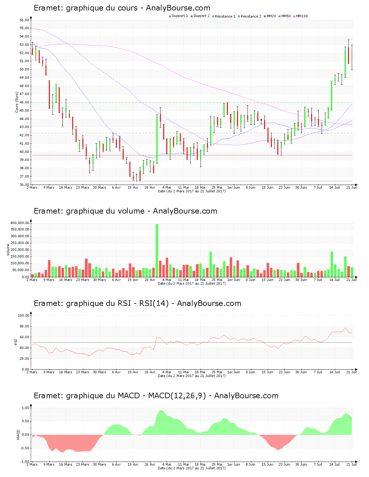 |L’action Eramet s’enchérit encore cette semaine, avec un mouvement haussier de 3.15%. Passant de 48.840 € à 50.380 € ces dernières séances, elle augmente désormais de 1.540 €. La demande sur Eramet la semaine dernière était extrêmement substantielle, représentée par un parcours haussier de 12.98%. Depuis la semaine dernière, la valeur atténue par conséquent son comportement haussier. Il s’agit de la première fois depuis 91 jours de cotations que la valeur Eramet franchit ce niveau. Remarquons, avec un pourcentage de 11.30% qui écarte ces cinq dernières séances le maximum du minimum, une volatilité sensible sur l’action.