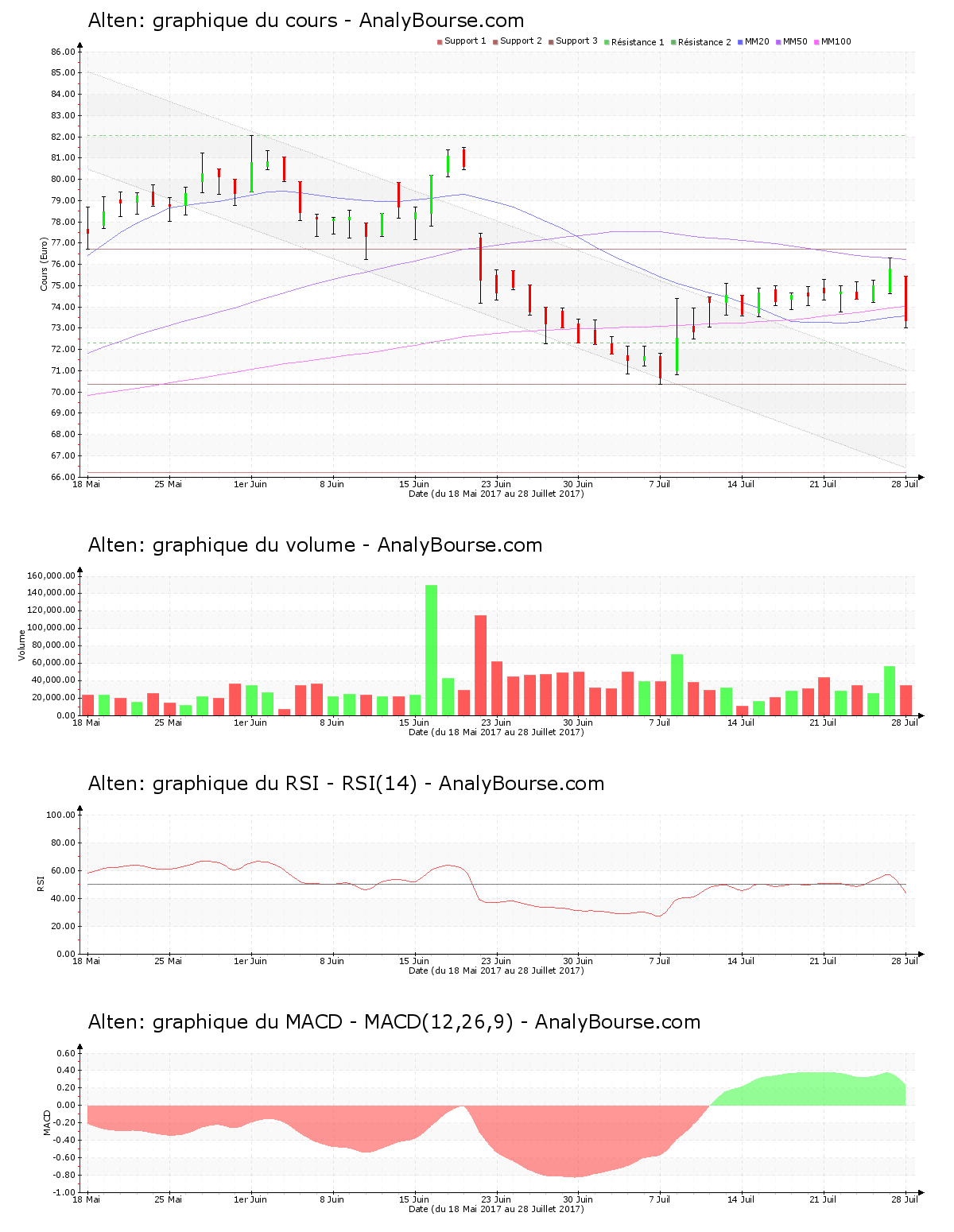 Ces informations constituent une analyse technique de l’action Alten au dimanche 30 juillet 2017. Cette analyse peut être invalidée par des éléments plus récents, et ne constitue en aucune manière une incitation d’achat ou de vente sur les marchés financiers. Le lecteur reste libre et responsable de l’interprétation et de l’usage faits de ces informations.