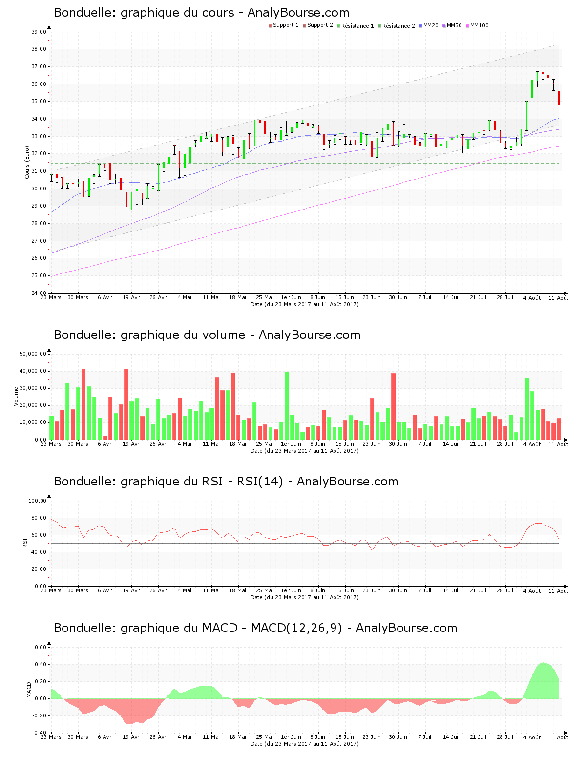 Pour les indicateurs, l’indicateur MACD est ces cinq dernières séances en vigoureuse diminution. C’est toutefois toujours une tendance du cours en solide hausse que ce dernier révèle à moyen-court terme. Ensuite, l’action Bonduelle dispose d’une moyenne mobile sur vingt jours positionnée au-delà de sa moyenne mobile sur cinquante jours, qui est elle-même localisée au-delà de sa moyenne mobile sur cent jours. L’action traduit ainsi un comportement en hausse sur la durée. Enfin, l’indicateur RSI est en diminution cette semaine. C’est cependant encore dans le niveau d’achat qu’il se positionne.