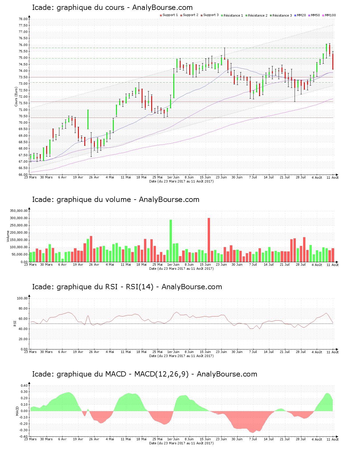 Ces informations constituent une analyse technique de l’action Icade au dimanche 13 août 2017. Cette analyse peut être invalidée par des éléments plus récents, et ne constitue en aucune manière une incitation d’achat ou de vente sur les marchés financiers. Le lecteur reste libre et responsable de l’interprétation et de l’usage faits de ces informations.