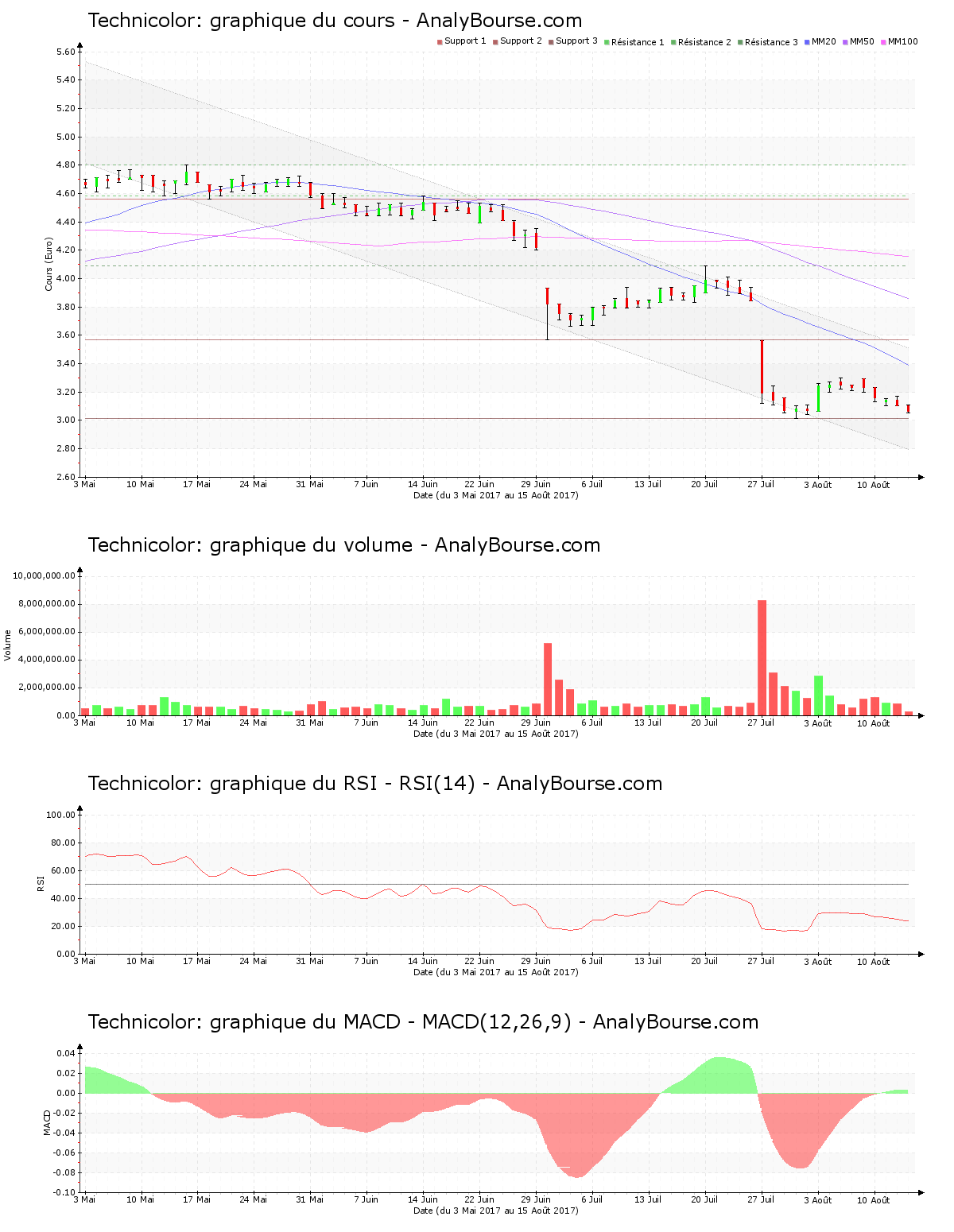 Avec un volume à 10:49 d’à peu près 241000 titres échangés, avec un cours décroissant de 1.29%, le parcours est encore mauvais ce mardi 15 août pour la valeur Technicolor. Avec un parcours baissier de 1.27%, cette dernière était déjà en décroissance hier. Allant de 3.100 € à 3.060 €, la valeur s’effrite dorénavant de 0.040 €. L’action Technicolor est dorénavant en régression depuis 7 jours. Avec un développement en solide décroissance de 5.85%, le cours de Technicolor est ainsi depuis le lundi 7 août 2017 attaqué. Le titre navigue maintenant près du support des 3.010 €.
