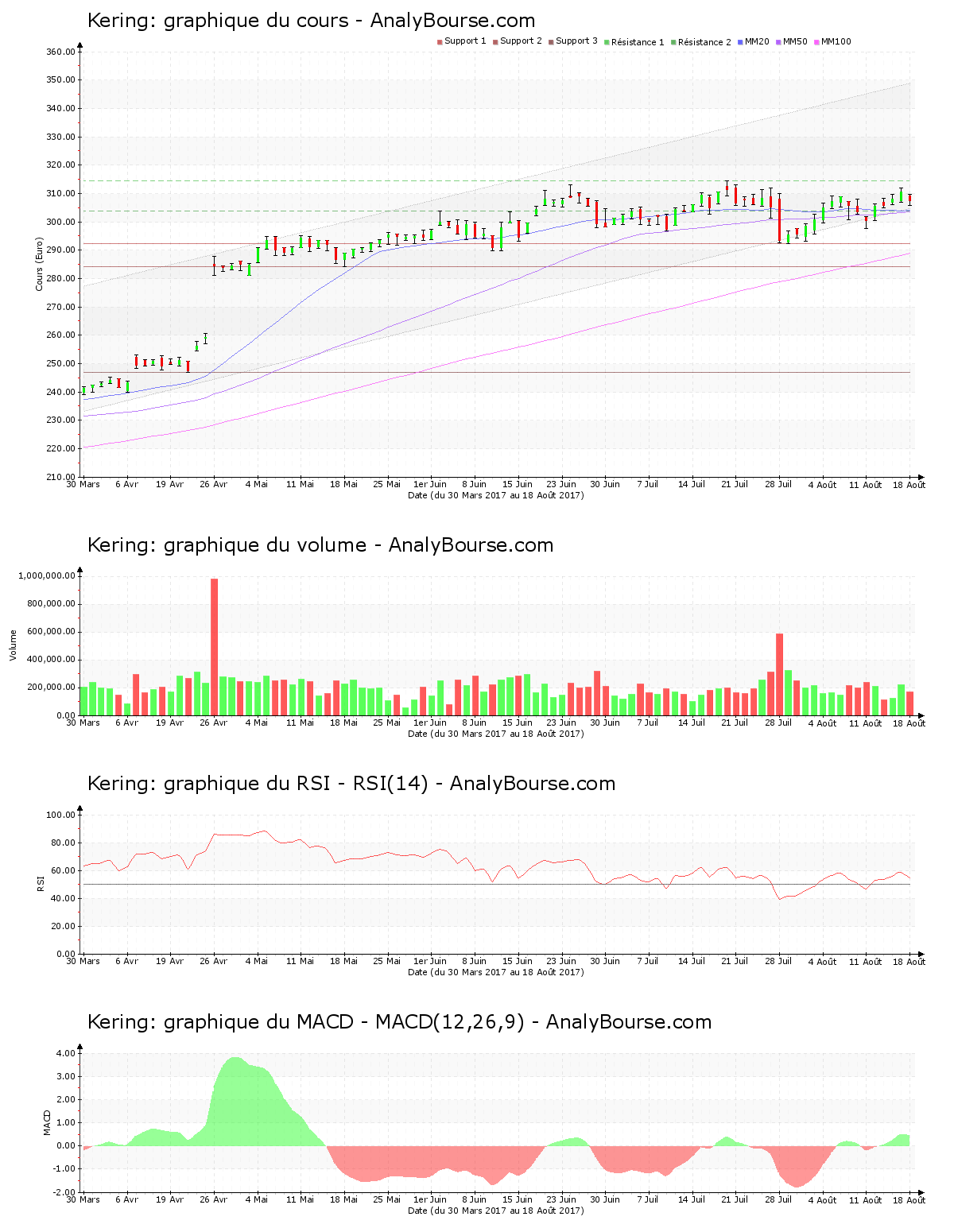 Ces informations constituent une analyse technique de l’action Kering au samedi 19 août 2017. Cette analyse peut être invalidée par des éléments plus récents, et ne constitue en aucune manière une incitation d’achat ou de vente sur les marchés financiers. Le lecteur reste libre et responsable de l’interprétation et de l’usage faits de ces informations.