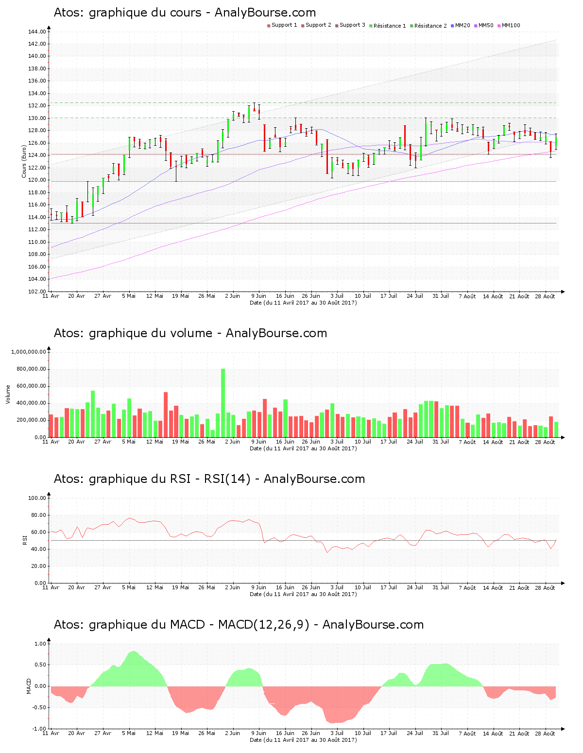 En ce qui concerne les indicateurs, le RSI est en croissance ce jour. Il a basculé au niveau d’achat, cela pourrait suggérer un prélude d’une évolution croissante sur le long terme pour l’action Atos. Le MACD est ce jour en forte progression. C’est malgré tout encore une trajectoire du titre en solide diminution que ce dernier indique sur le moyen-court terme.