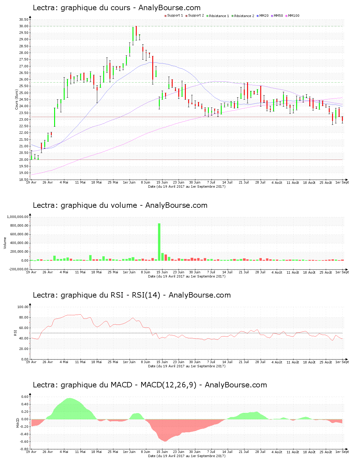 Côté indicateurs, on remarque que l’indicateur MACD est en ferme régression ces cinq derniers jours. C’est à présent une trajectoire du titre en solide baisse qu’il représente sur le moyen-court terme. Pour sa part, concernant l’indicateur RSI, on remarque qu’il est relativement stable ces derniers jours. Ce dernier se situe par conséquent encore au niveau de vente. La moyenne mobile sur vingt jours de l’action Lectra se trouve en deçà de la moyenne mobile sur cinquante jours, qui se place quant à elle en deçà de la moyenne mobile sur cent jours. A longue échéance, le mouvement de l’action est ainsi en diminution. La moyenne mobile sur vingt jours de l’action Lectra se place à présent en deçà de sa moyenne mobile sur cinquante jours depuis 44 séances.