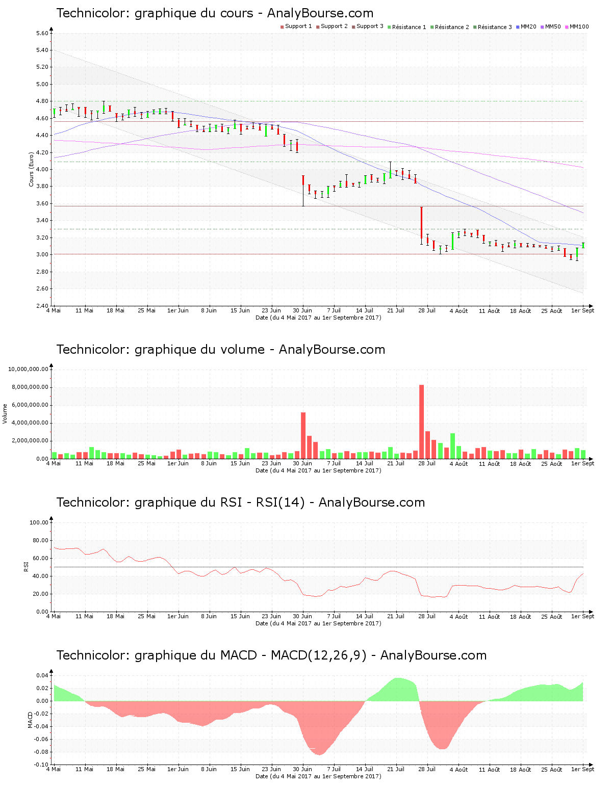 En ce qui concerne les indicateurs, la valeur Technicolor dispose d’une moyenne mobile sur vingt jours positionnée en deçà de sa moyenne mobile sur cinquante jours, qui est quant à elle positionnée en deçà de sa moyenne mobile sur cent jours. Le parcours de l’action est ainsi en régression sur la durée. La moyenne mobile sur vingt jours de la valeur Technicolor se situe maintenant en-dessous de sa moyenne mobile sur cinquante jours depuis 53 séances. L’indicateur RSI est ces derniers jours en augmentation. C’est cependant toujours au niveau de vente que ce dernier se positionne. Pour finir, on constate que le MACD est assez stable ces derniers jours. Ce dernier révèle donc toujours une trajectoire du cours en augmentation à moyen-court terme.