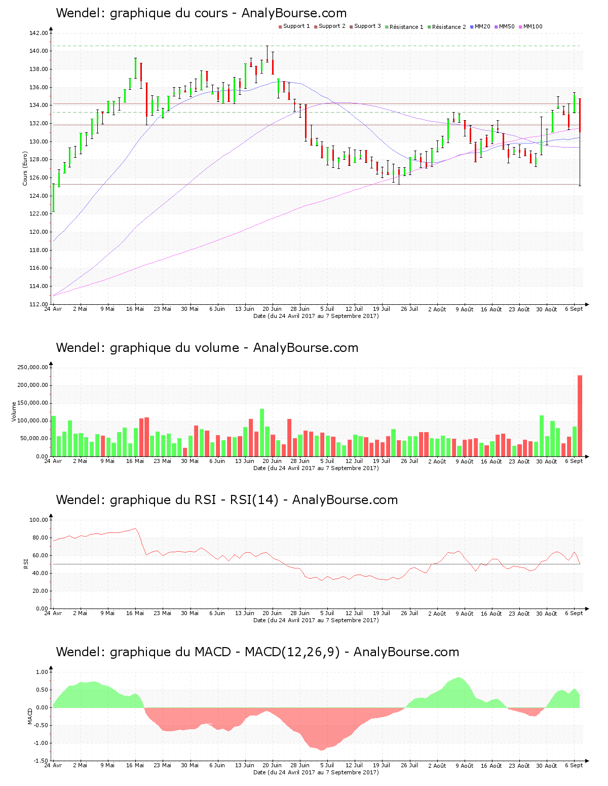 Wendel est en une semaine attaqué, avec un mouvement en régression de 1.58%. Matérialisée par un développement baissier de 0.27%, l’intention d’achat sur le cours sur un mois est de même neutre. La sollicitation sur Wendel sur un an est néanmoins remarquablement grande, illustrée par un comportement haussier de 28.04%.