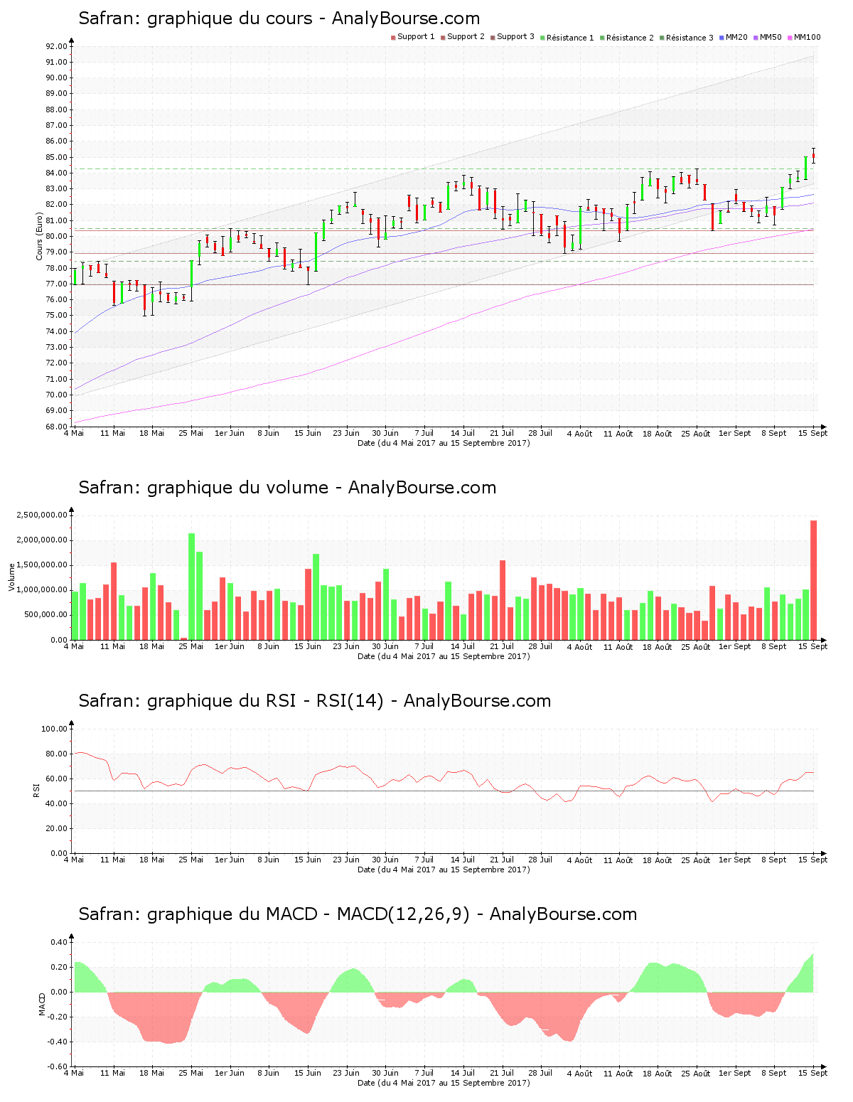 Ces informations constituent une analyse technique de la valeur Safran au samedi 16 septembre 2017. Cette analyse peut être invalidée par des éléments plus récents, et ne constitue en aucune manière une incitation d’achat ou de vente sur les marchés financiers. Le lecteur reste libre et responsable de l’interprétation et de l’usage faits de ces informations.