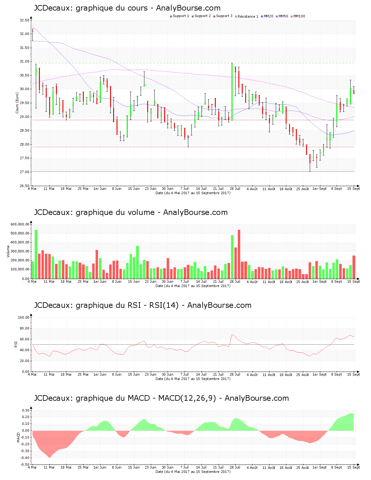 En ce qui concerne les indicateurs, l’indicateur MACD est en conséquente croissance ces cinq dernières séances de cotations. C’est désormais une trajectoire du cours en importante hausse que ce dernier dévoile à moyen-court terme. L’indicateur RSI est relativement stable cette semaine. Ce dernier se place donc encore au niveau d’achat. La valeur JCDecaux possède une moyenne mobile sur vingt jours positionnée en deçà de sa moyenne mobile sur cinquante jours, qui est pour sa part placée en-dessous de sa moyenne mobile sur cent jours. L’action traduit donc un parcours décroissant sur la durée. La moyenne mobile sur cinquante jours de l’action JCDecaux se trouve à présent en deçà de sa moyenne mobile sur cent jours depuis 67 jours de cotations.