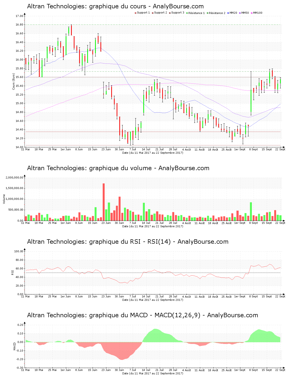 Concernant les indicateurs, l’indicateur RSI est assez stable ces derniers jours. C’est ainsi encore dans le niveau d’achat que ce dernier se positionne. Pour sa part, la moyenne mobile sur 20 jours de l’action Altran Technologies a croisé la moyenne mobile sur 50 jours mercredi dernier. Depuis à présent 38 séances, la moyenne mobile sur 50 jours de l’action Altran Technologies se localise en-dessous de sa moyenne mobile sur 100 jours. Pour terminer, concernant le MACD, on note qu’il est en substantielle régression ces cinq dernières séances. Il représente malgré ceci toujours une tendance du titre en hausse sur le moyen terme.