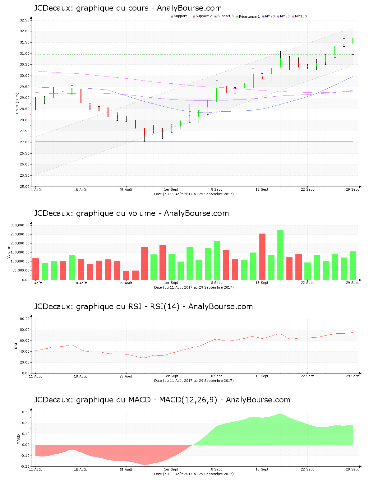 |Avec un cours haussier de 4.04%, le bilan est encore franchement encourageant cette semaine pour l’action JCDecaux. Allant de 30.450 € à 31.680 € ces cinq dernières séances, la valeur bondit désormais de 1.230 €. Avec un comportement en croissance de 1.98%, elle était déjà la semaine dernière recherchée. Donc, l’évolution croissante de la semaine dernière gagne de la vitesse ces dernières séances pour la valeur. Le titre a passé la résistance des 30.950 € cette semaine. C’est au niveau supérieur de son canal que la valeur évolue.