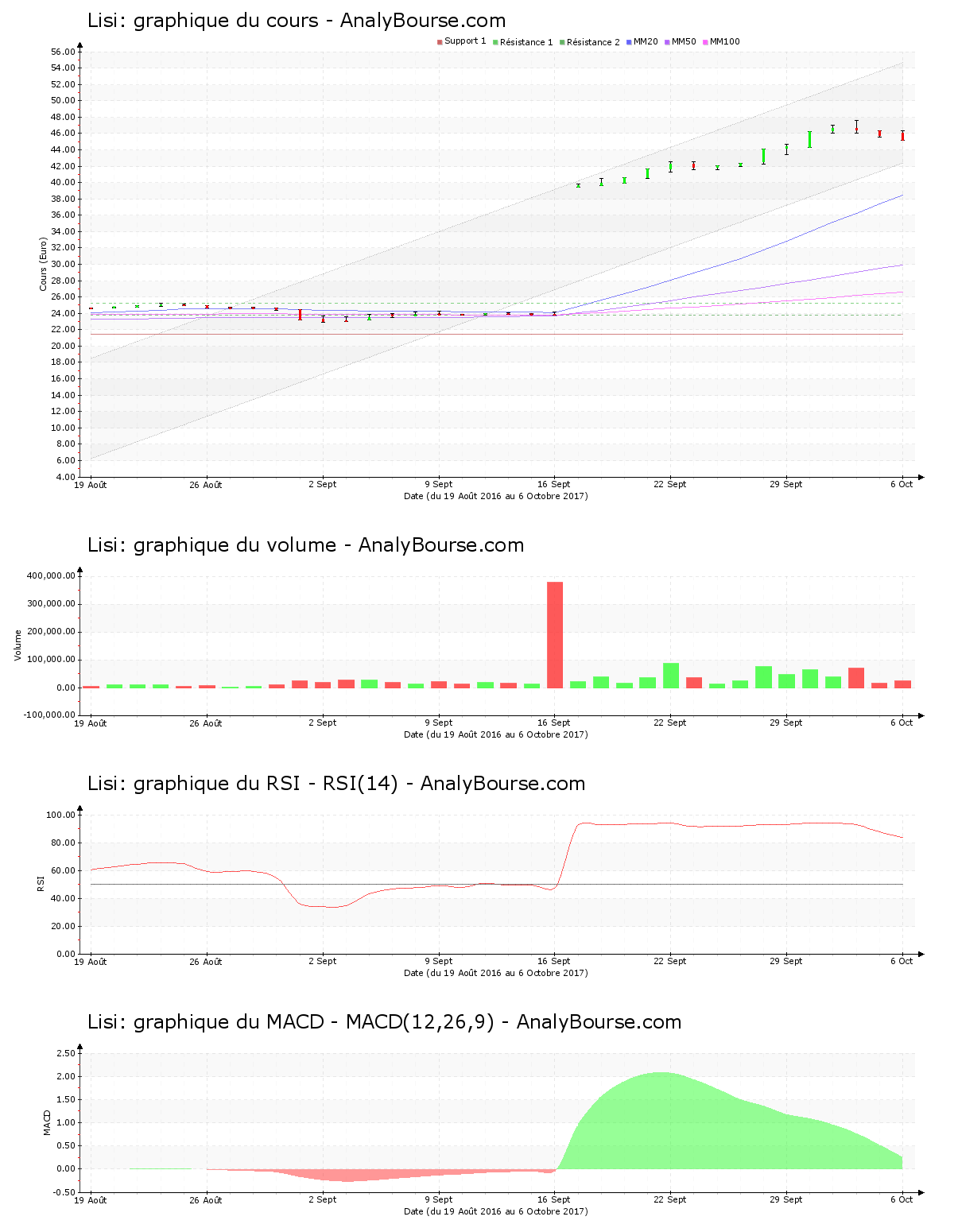 Du côté des indicateurs, le MACD est en importante régression ces cinq dernières séances de cotations. Il esquisse toutefois toujours une trajectoire du titre en ferme progression à court-moyen terme. La moyenne mobile sur 20 jours de l’action Lisi est localisée au-delà de sa moyenne mobile sur 50 jours, qui est quant à elle située au-delà de sa moyenne mobile sur 100 jours. La valeur montre donc un comportement haussier sur une longue période. Depuis finalement 43 jours de cotations, la moyenne mobile sur 20 jours de l’action Lisi se place au-delà de sa moyenne mobile sur 50 jours. Pour terminer, on constate que ces cinq derniers jours de cotations l’indicateur RSI est assez stable. Ce dernier se situe donc encore dans le niveau de surachat.