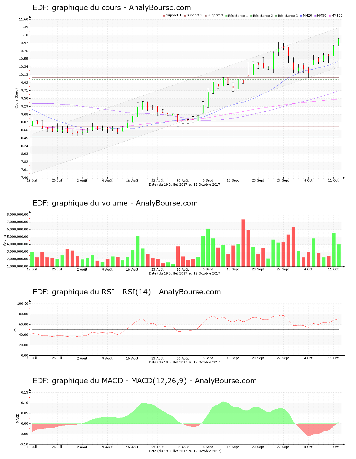 Concernant le MACD, on constate que ce dernier est en progression ce jeudi 12 octobre. Ce jeudi 12 octobre, l’indicateur MACD a basculé en secteur positif, ce qui peut caractériser un engagement d’une trajectoire haussière pour l’action EDF à longue échéance.