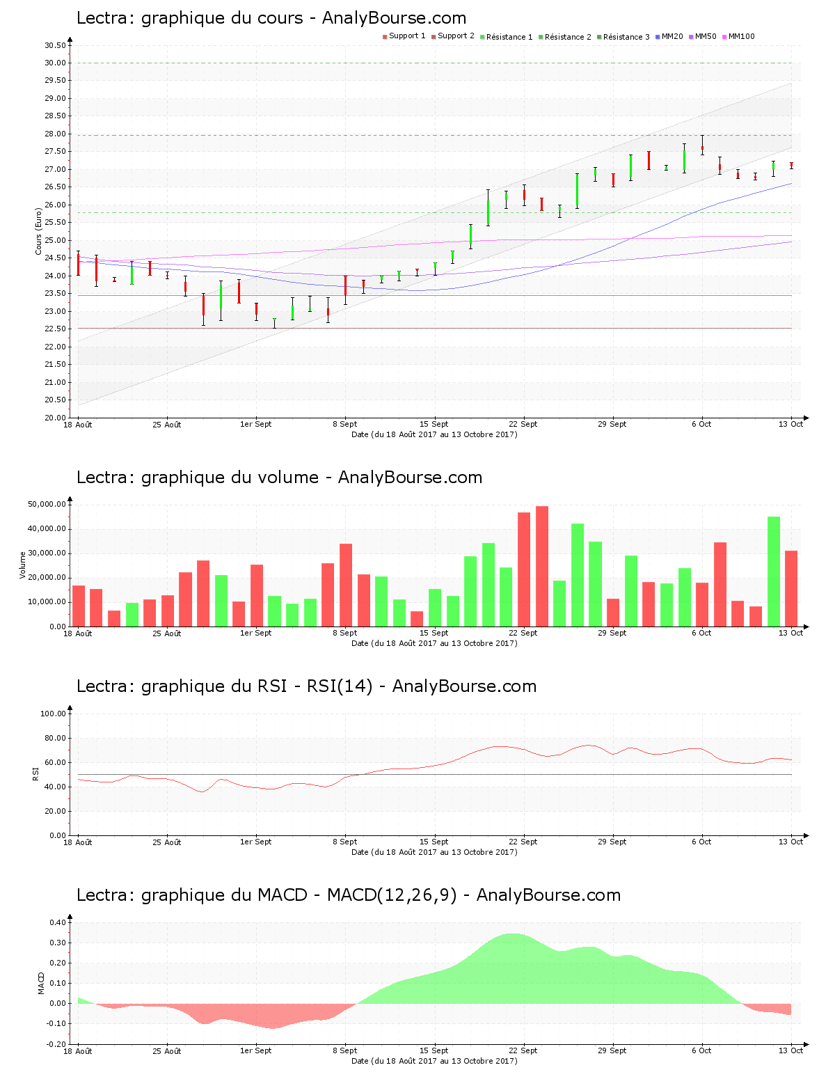 Du côté des indicateurs, voilà dorénavant 39 jours que la moyenne mobile sur cinquante jours de la valeur Lectra se localise en deçà de sa moyenne mobile sur cent jours. On note que ces cinq derniers jours de cotations le MACD est en solide régression. Il esquisse maintenant une trajectoire du titre en décroissance à court-moyen terme. L’indicateur MACD a basculé en terrain négatif mercredi dernier, ceci pourrait signaler une ébauche d’une orientation décroissante à longue échéance pour Lectra. Pour terminer, concernant l’indicateur RSI, on remarque qu’il est plutôt stable ces cinq derniers jours de cotations. Ce dernier se trouve ainsi encore au niveau d’achat.