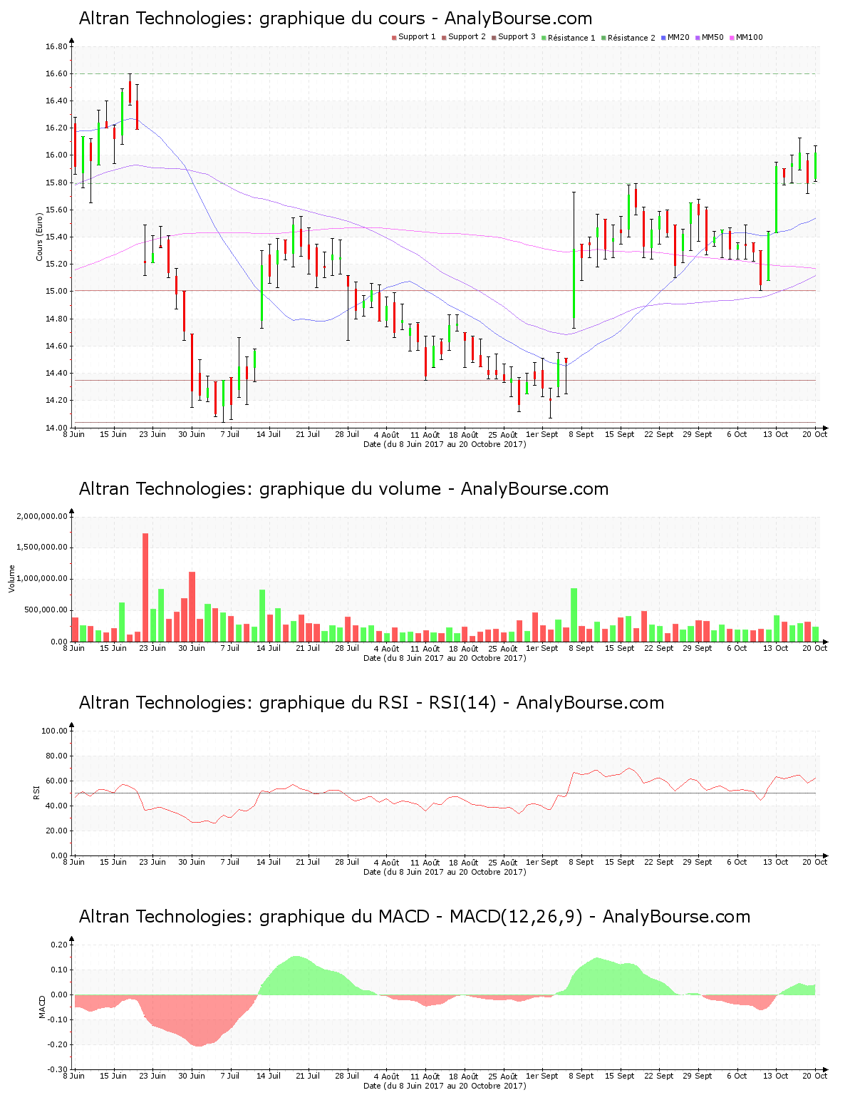 Ces informations constituent une analyse technique de la valeur Altran Technologies au dimanche 22 octobre 2017. Cette analyse peut être invalidée par des éléments plus récents, et ne constitue en aucune manière une incitation d’achat ou de vente sur les marchés financiers. Le lecteur reste libre et responsable de l’interprétation et de l’usage faits de ces informations.