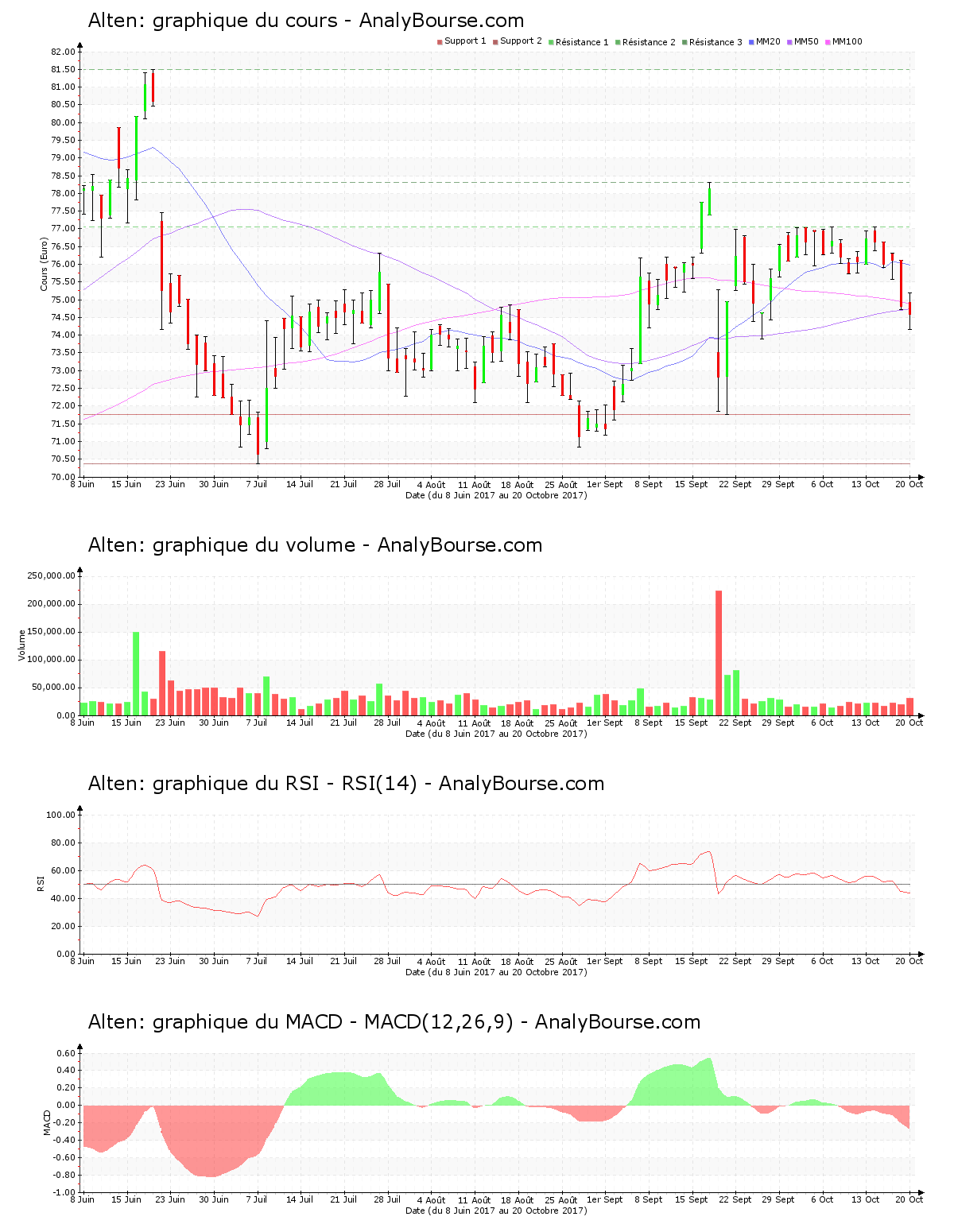 Pour l’indicateur MACD, on constate que ce dernier est en substantielle baisse ces derniers jours. C’est dorénavant une trajectoire du titre en substantielle diminution qu’il révèle à court-moyen terme. Le RSI est ces cinq dernières séances de cotations en baisse. Ce dernier se positionne dorénavant au niveau de vente. Depuis maintenant 48 jours, la moyenne mobile sur 50 jours de l’action Alten se localise en-dessous de sa moyenne mobile sur 100 jours.