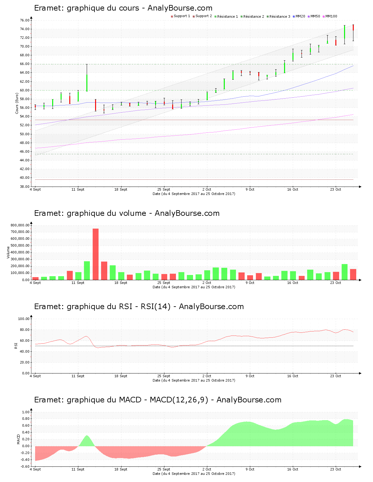 Eramet se déprécie aujourd’hui, avec un cours en décroissance de 1.31%, avec un volume à la clôture d’approximativement 157000 titres échangés. L’action atteint dorénavant la somme de 73.720 €. Avec un cours en progression de 6.24%, Eramet explosait par contre hier. L’équilibre acheteurs/vendeurs se retourne ainsi avec force aujourd’hui. Le titre évoluant dans des limites de 5.22%, Eramet dévoile des échanges assez chahutés ce mercredi 25 octobre.