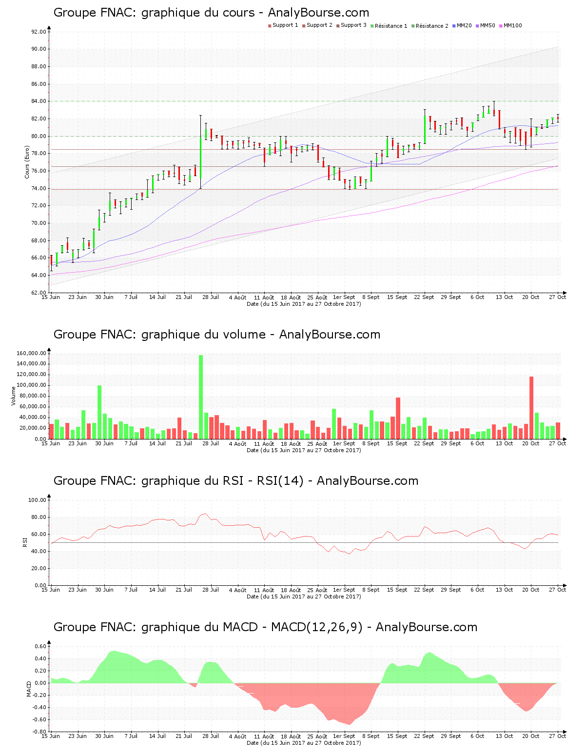 On observe que l’indicateur MACD est en importante croissance ces cinq dernières séances. C’est dorénavant une trajectoire du cours relativement stable que ce dernier indique sur le moyen-court terme. Le MACD a basculé en secteur positif hier, cela pourrait esquisser une amorce d’une évolution croissante à long terme pour Groupe FNAC. Pour sa part, l’action Groupe FNAC dispose d’une moyenne mobile sur vingt jours placée au-delà de sa moyenne mobile sur cinquante jours, qui est quant à elle placée au-delà de sa moyenne mobile sur cent jours. Sur une longue période, l’action enregistre donc un parcours haussier. Enfin, on observe que ces cinq derniers jours de cotations le RSI est en progression. Ce dernier se situe désormais au niveau d’achat.
