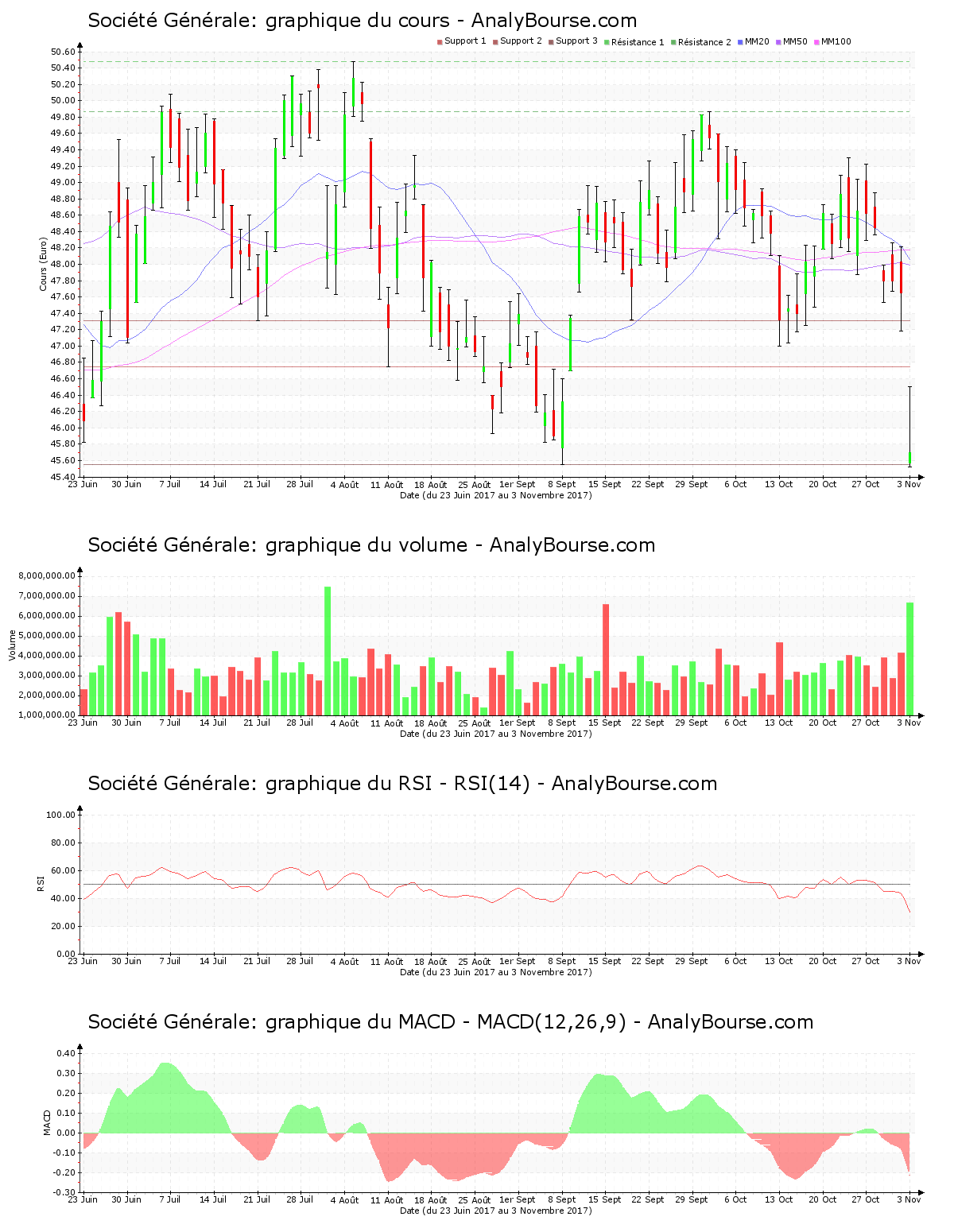 Avec un cours en régression de 6.01%, le parcours est remarquablement négatif ces derniers jours pour l’action Société Générale. Cette dernière s’écroule à présent de 2.920 €, évoluant de 48.620 € à 45.700 € ces cinq dernières séances de cotations. Société Générale était plutôt stable la semaine dernière. Le mouvement baissier reprend donc ces cinq derniers jours de cotations. Le cours a franchi le support des 46.750 € cette semaine. Le support suivant se place à 45.550 €. Constatons, avec un pourcentage de 7.36% qui éloigne cette semaine les extrêmes, une manifeste fébrilité sur Société Générale. Enfin, le cours a supporté également un gap à la baisse cette semaine hier.