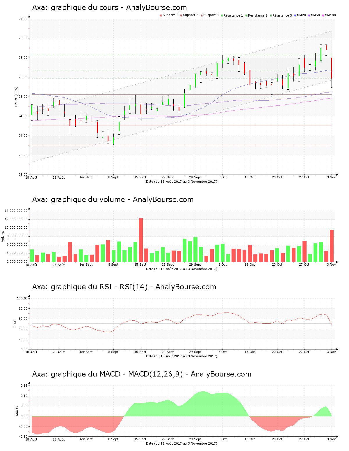 Pour les indicateurs, on repère que le MACD est stable cette semaine. Ce dernier caractérise par conséquent toujours une tendance du cours plutôt stable sur le moyen terme. L’indicateur MACD a basculé en terrain positif mardi dernier, ce qui pourrait révèler un début d’une trajectoire en progression à longue échéance pour Axa. On repère que cette semaine le RSI est en régression. C’est finalement dans le niveau neutre qu’il se place. Pour terminer, la moyenne mobile sur 20 jours de la valeur Axa se situe au-delà de la moyenne mobile sur 50 jours, et la moyenne mobile sur 50 jours se localise pour sa part au-delà de la moyenne mobile sur 100 jours. L’action exprime ainsi un cours haussier à longue échéance.