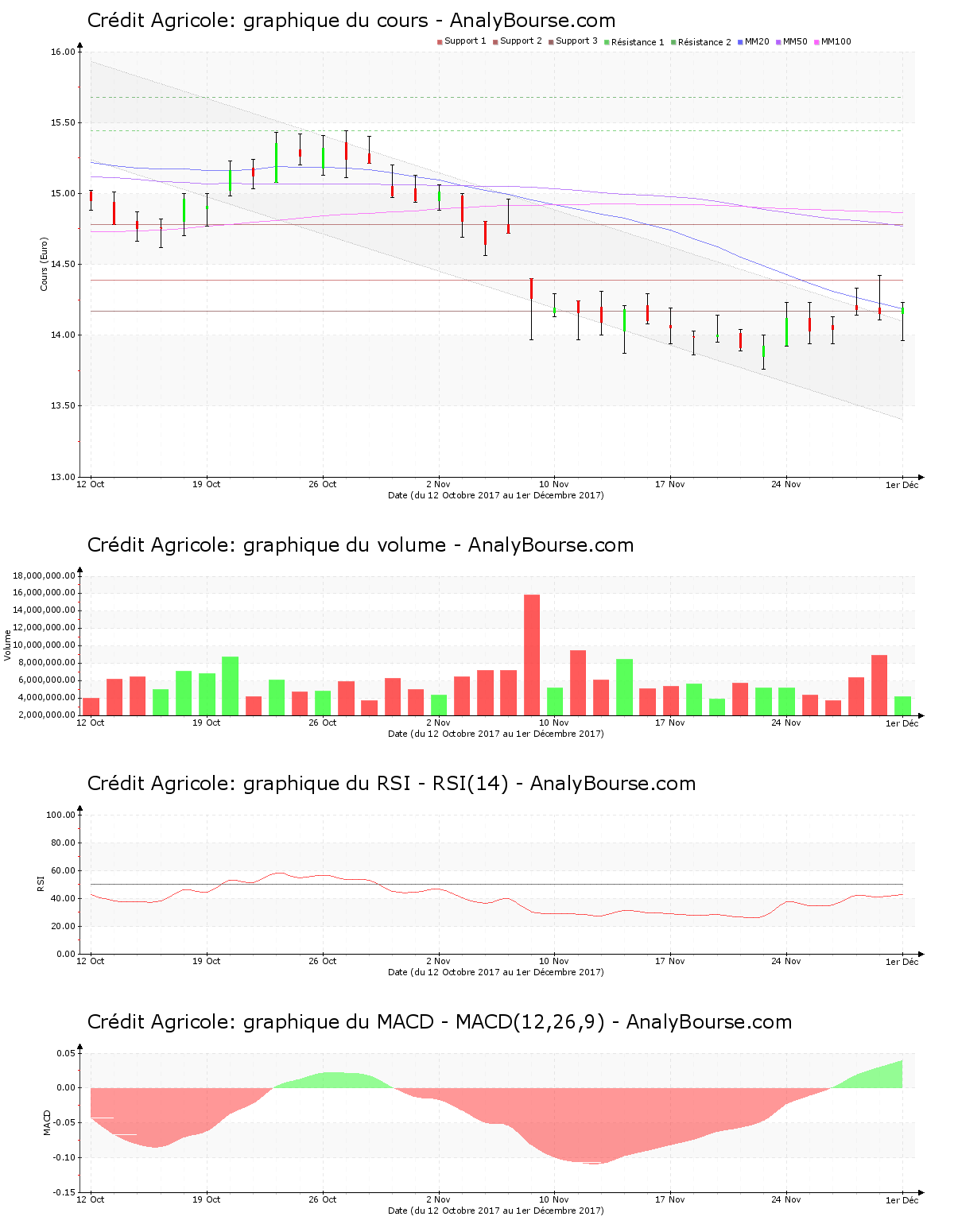 Concernant les indicateurs, on remarque que ces dernières séances le MACD est en vigoureuse progression. C’est maintenant une trajectoire du cours en croissance que ce dernier révèle à court-moyen terme. Mardi dernier, le MACD a basculé en secteur positif, cela peut indiquer un amorcement d’une évolution haussière à longue échéance pour Crédit Agricole. De son côté, la moyenne mobile sur 20 jours de l’action Crédit Agricole se positionne en deçà de la moyenne mobile sur 50 jours, et la moyenne mobile sur 50 jours se situe elle-même en deçà de la moyenne mobile sur 100 jours. L’action exprime ainsi un parcours en décroissance sur une longue période. Enfin, l’indicateur RSI est relativement stable cette semaine. Ce dernier se positionne par conséquent encore au niveau de vente.