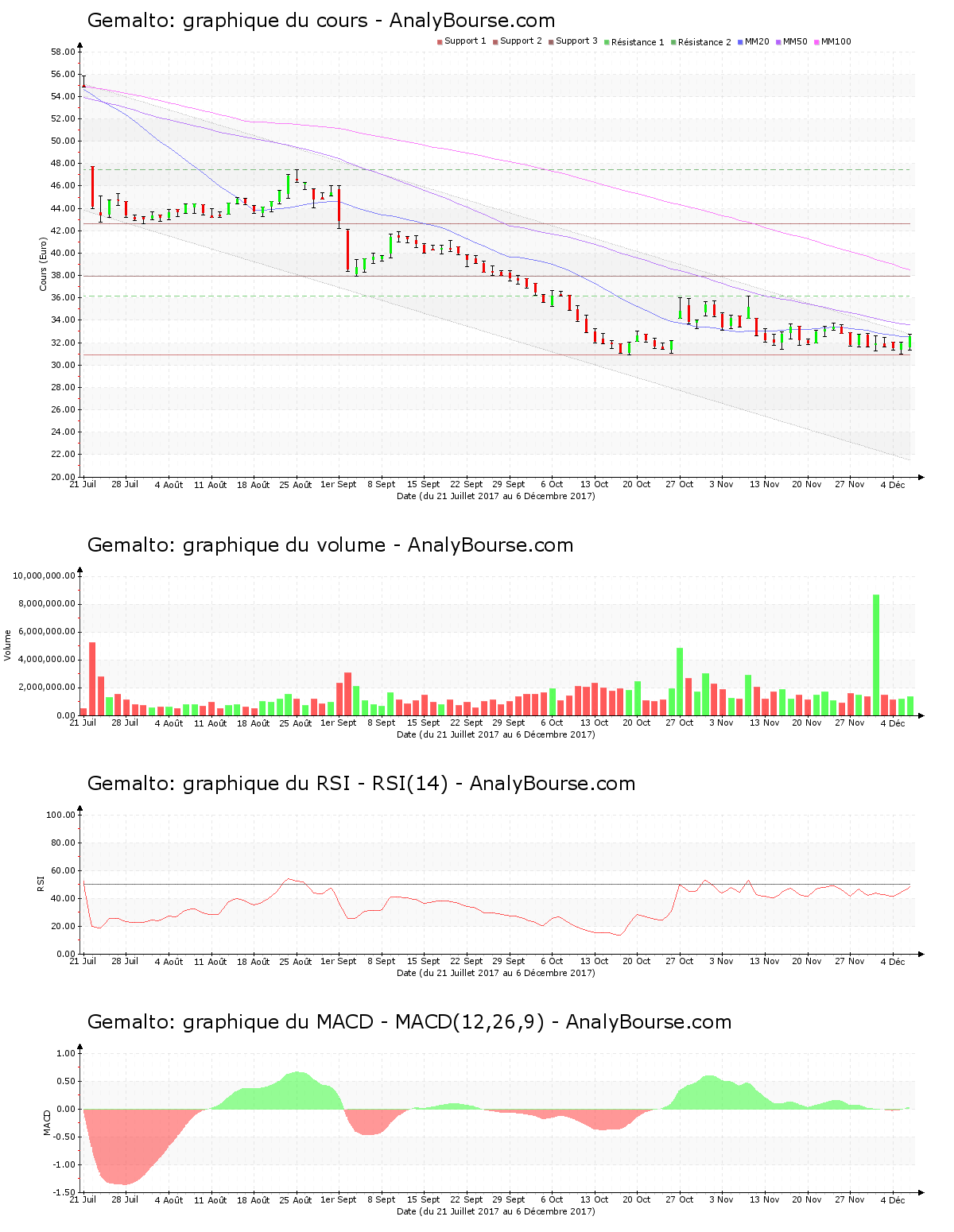En ce qui concerne l’indicateur MACD, on observe qu’il est en grande croissance aujourd’hui. L’indicateur MACD a basculé en territoire positif ce jour, ce qui pourrait ébaucher un enclenchement d’une évolution croissante sur une longue période pour l’action Gemalto.