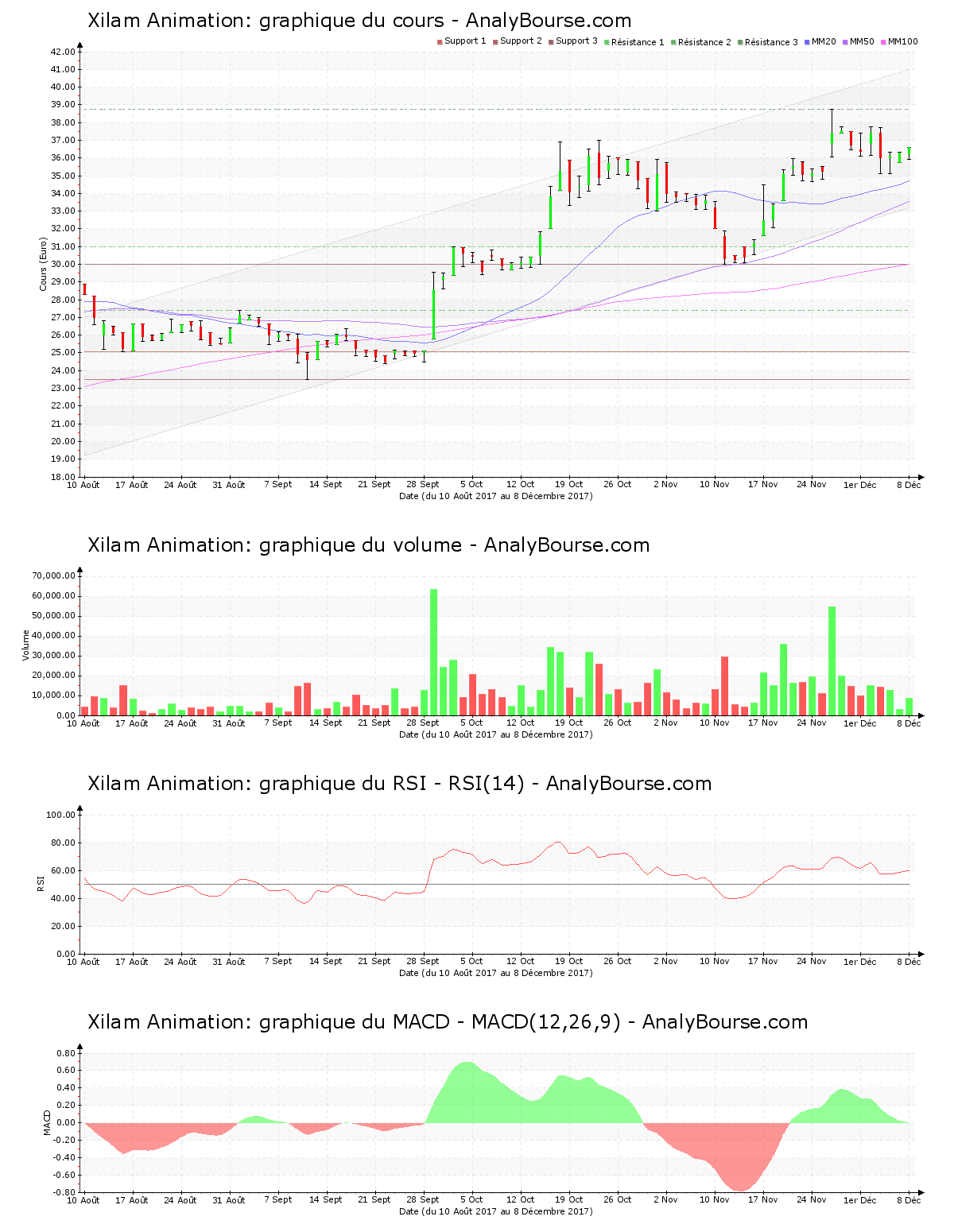 |Avec un parcours haussier de 0.66%, le parcours est à l’équilibre ces dernières séances pour la valeur Xilam Animation. Cette dernière atteint en effet seulement un montant de 36.600 €. Xilam Animation affichait au contraire la semaine dernière une pression acheteuse, animée par un parcours haussier de 3.59%. Le cours navigue finalement près de la résistance des 36.990 €. Xilam Animation fluctue ces cinq derniers jours de cotations dans un range de 7.46%, montrant une relative fébrilité sur le cours. L’action se situe au milieu du canal à l’intérieur duquel elle se délimite depuis quelques semaines.