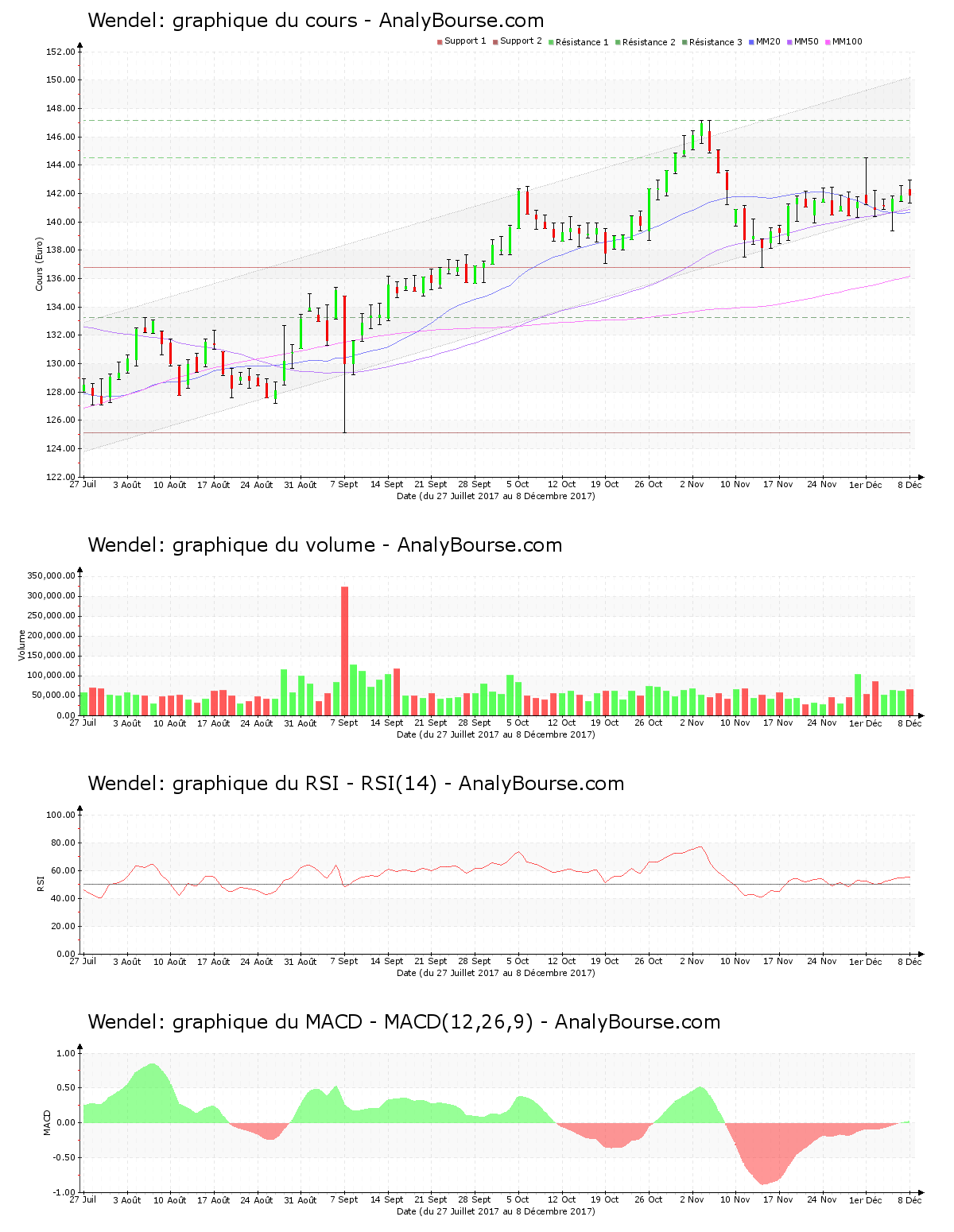 |Wendel gonfle faiblement encore ces cinq dernières séances, avec un cours en progression de 0.42%. Avec un cours en diminution de 0.21%, le résultat était déjà neutre la semaine dernière pour l’action Wendel. Elle atteint par conséquent finalement un montant de 141.900 €. Le développement du cours l’entraîne finalement à proximité de la résistance des 144.500 €. L’action se positionne à proximité de la limite inférieure du canal à l’intérieur duquel elle varie depuis plusieurs semaines.