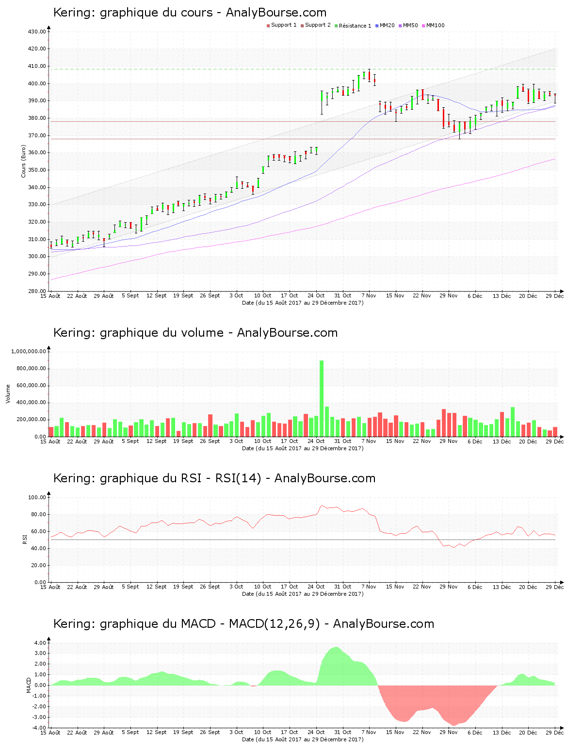 En ce qui concerne les indicateurs, concernant le RSI, on remarque que ce dernier est assez stable ces dernières séances. Ce dernier se situe donc encore dans le niveau d’achat. Ensuite, la moyenne mobile sur vingt jours de l’action Kering se trouve au-dessus de la moyenne mobile sur cinquante jours, et la moyenne mobile sur cinquante jours se place elle-même au-delà de la moyenne mobile sur cent jours. La valeur révèle ainsi un comportement haussier à longue échéance. Depuis maintenant 89 séances de cotations, la moyenne mobile sur vingt jours de la valeur Kering se situe au-dessus de sa moyenne mobile sur cinquante jours. Pour finir, on repère que le MACD est en forte diminution ces cinq dernières séances. C’est malgré tout encore une évolution du cours en grande progression que ce dernier dessine à moyen terme.